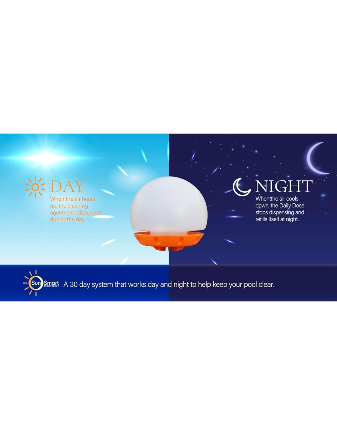 - Cuidado de Piscina Sin Esfuerzo: La Dosis Diaria cuida de su piscina mientras usted se relaja. Utiliza los cambios de temperatura naturales de día/noche para mezclar automáticamente el agua con un Paquete Puro, ayudando a mantener su piscina clara todos los días.