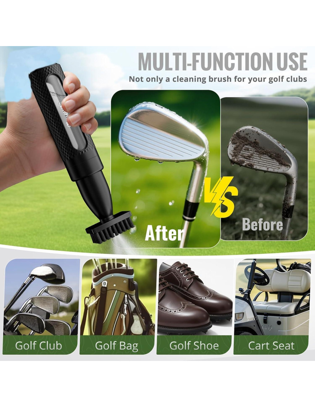- Accesorios de Golf Premium: Hemos mejorado la cabeza del cepillo de este cepillo de golf basado en comentarios de muchos entusiastas del golf. Con un diseño profesional a prueba de fugas, ayuda a mantener secos tus otros accesorios de golf de manera más efectiva. La salida de agua en estilo spray asegura una limpieza más eficiente de tu equipo de golf. Antes de cada uso, simplemente presiona 4-5 veces para activar el flujo de agua. Las cerdas resistentes pero flexibles facilitan la eliminación de suciedad de las ranuras de tus palos de golf.
