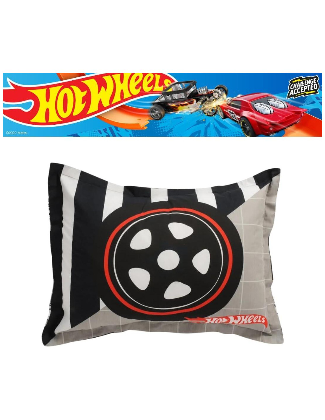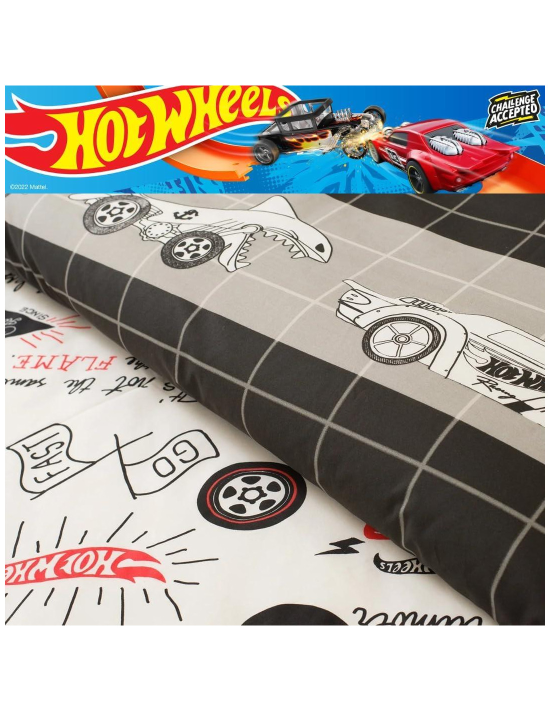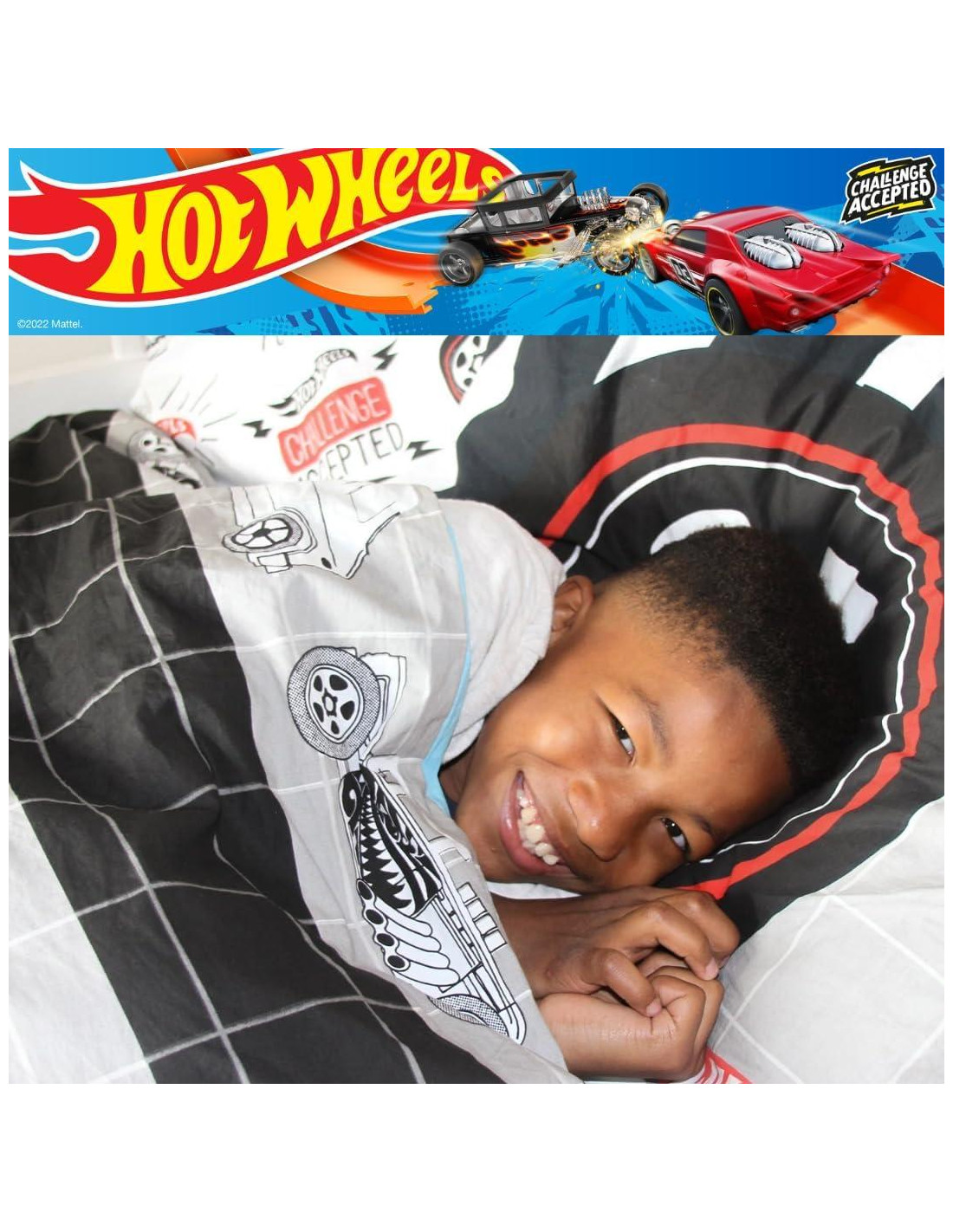 - DISEÑO HOT WHEELS: Estarán corriendo a la cama con esta funda nórdica Hot Wheels que presenta Shark Bite, Rip Rod y Bone Shaker, los coches de carreras más geniales en la pista. Las franjas de contraste en la funda de almohada los harán hacer caballitos en su sueño.