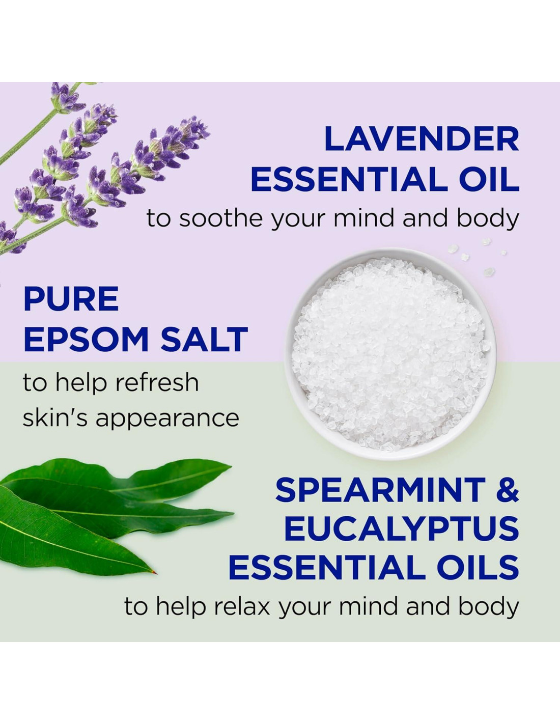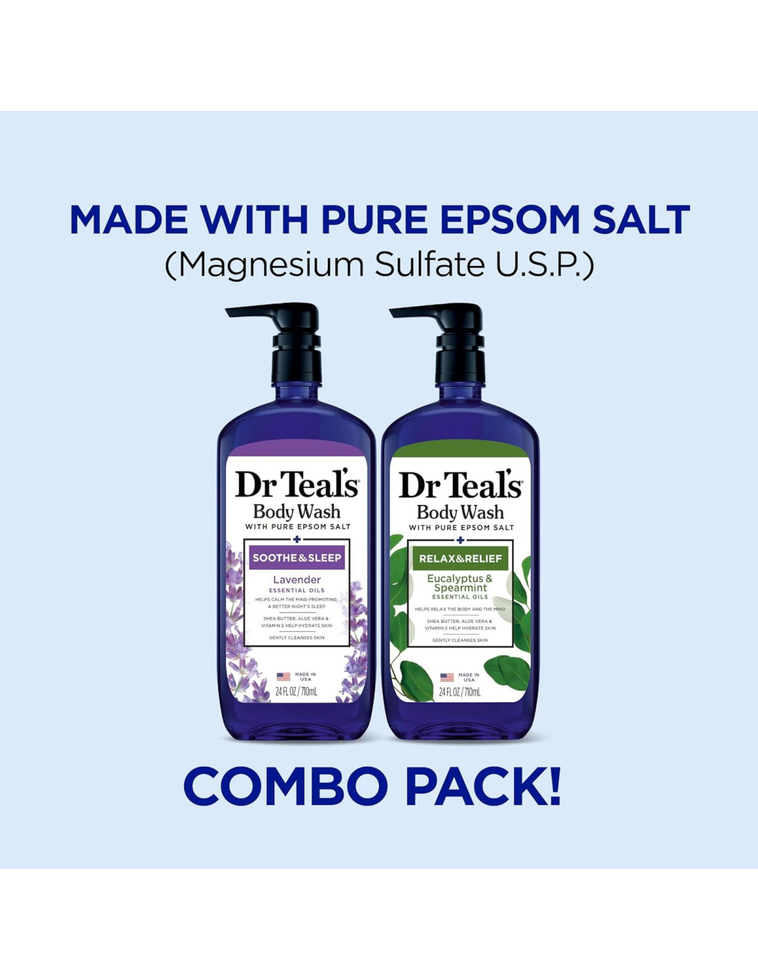 Desestrésate mientras te bañas con el Dúo de Ducha Corporal de Lavanda y Eucalipto de Dr Teal's con Sal de Epsom Pura. Cada ducha corporal incluye Sal de Epsom Pura para relajar los músculos cansados. La Ducha Corporal de Lavanda de Dr Teal's con Sal de Epsom Pura presenta lavanda para ayudar a promover un mejor sueño nocturno. La Ducha Corporal de Eucalipto de Dr Teal's con Sal de Epsom Pura contiene eucalipto y menta para una experiencia refrescante que calma los sentidos mientras te bañas. Mezcla con tu solución de remojo de Sal de Epsom Pura de Dr Teal's favorita para crear un exfoliante. Los productos de Dr Teal's son veganos y libres de crueldad y no contienen ingredientes agresivos como parabenos y ftalatos.
