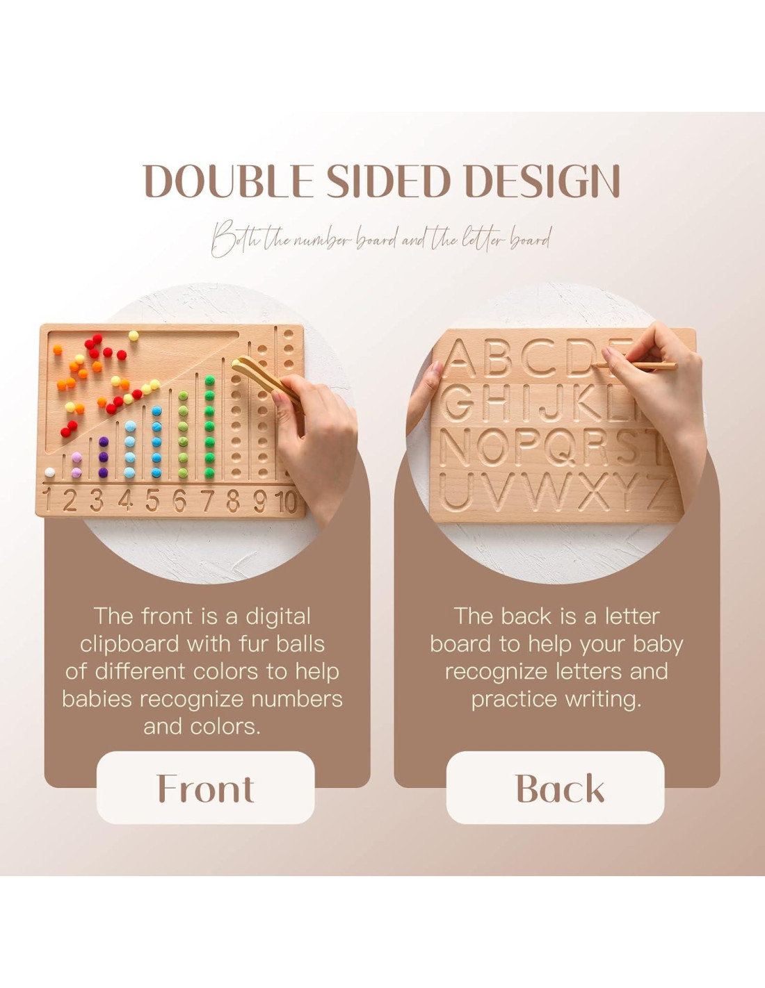 - Tablero de doble cara: Un lado es un juego de tablero de cuentas de madera para ayudar a los niños a practicar el conteo y escritura de números del 1 al 10, y el otro lado es un tablero de trazado de alfabeto para practicar el reconocimiento de letras y la correlación con palabras. Genial para el desarrollo cognitivo temprano.