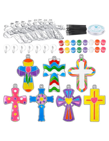 - Haz 28 Atrapa Sol de Cruces: este paquete incluye 28 sets de kit de atrapa sol de cruces para ventanas, incluye 28 piezas de atrapa sol de plástico en 7 diseños (4 piezas por estilo, aproximadamente 7.6 cm x 10.8 cm), 4 tiras de 8 mini tarros de pintura (8 colores arcoíris, 5 ml por tarro), 28 piezas de pinceles, 1 rollo de hilo colgante transparente (14.9 m de largo), 28 piezas de ganchos de succión; Cantidad suficiente y tamaño adecuado para que uses y apliques