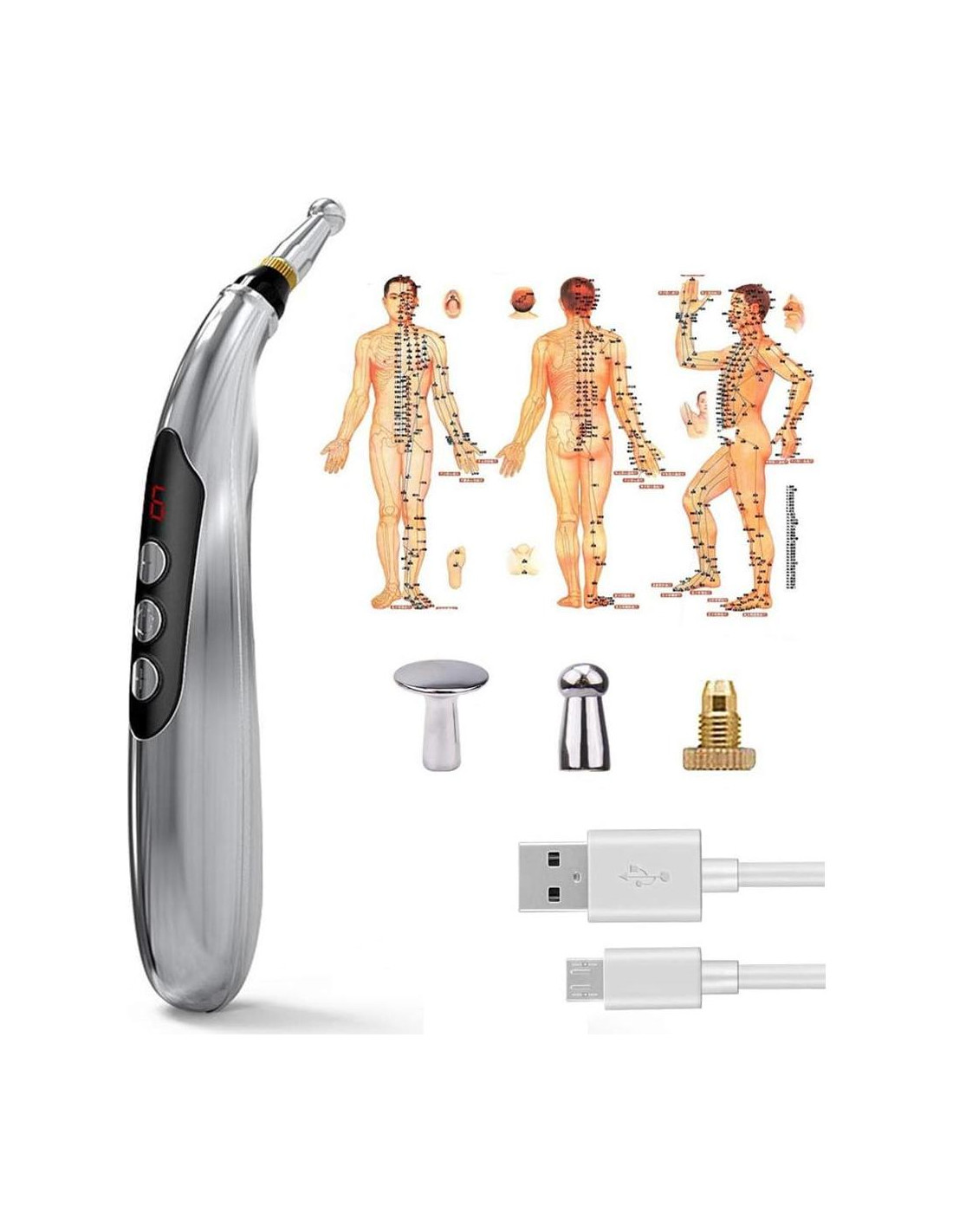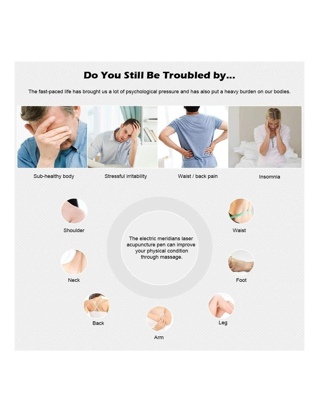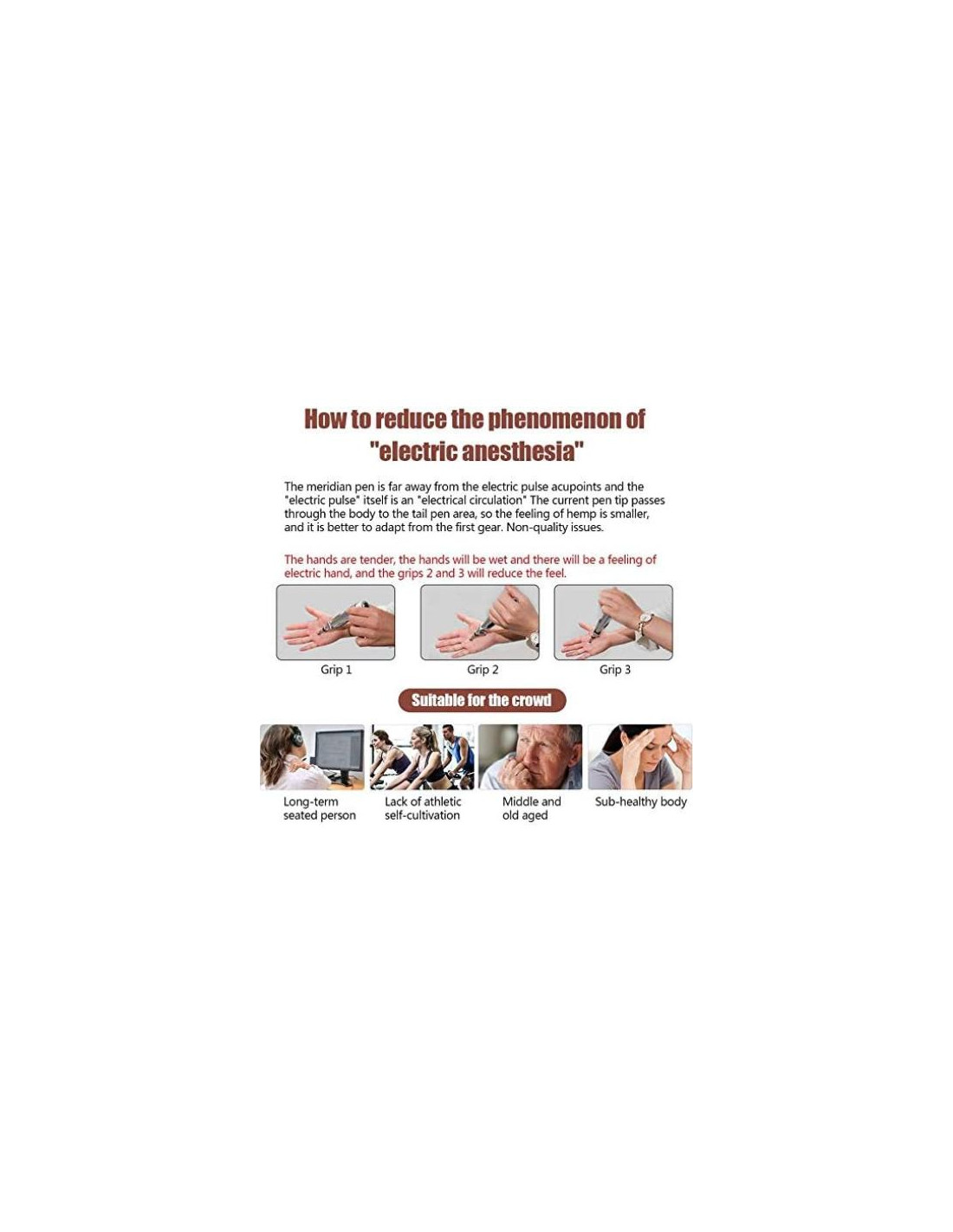 El bolígrafo de meridianos es un producto electrónico de alta tecnología basado en la combinación de la teoría de meridianos de la medicina tradicional china y la tecnología moderna de bioingeniería. Puede estimular la piel de manera flexible, activar el tejido cutáneo, prevenir la flacidez y el envejecimiento de la piel, aflojar músculos congelados, aliviar el dolor muscular. Te hace lucir joven y renovado. Es un gran producto para nuestro cuidado diario de belleza y salud. El bolígrafo de acupuntura eléctrica masajeador de puntos gatillo estimula la piel de manera flexible mediante pulsos eléctricos. Estas sensaciones son como "Estimulación Eléctrica" "Sensación de Acupuntura", así es como funciona el Bolígrafo Electrónico de Meridianos, por favor no te preocupes. Por favor, comienza en el nivel más bajo en el cuerpo y área facial para que puedas acostumbrarte gradualmente desde un nivel más bajo. Usa 1-2 veces al día, 10-15 minutos cada vez, 10 días por ciclo. Al sostener el bolígrafo, diferentes personas sienten diferentes niveles, las personas con manos tiernas o húmedas sentirán más fuerte. Y de acuerdo con la proporción de sostener el bolígrafo con la mano, el nivel que encuentres será diferente. Material: ABS Potencia: 0.6W Frecuencia de pulso: 6HZ Ancho de pulso: 160-180US Pico de pulso: 0-500 V Corriente de trabajo: menos de 150MA Capacidad de la batería: 450 mAh Tiempo de carga: 2-3 horas Tiempo de trabajo: 3-4 horas