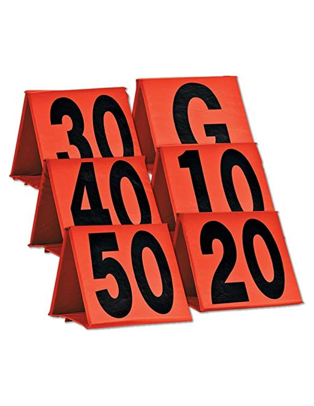 Prepárate para el día del juego con el Set de Marcadores de Campo de Fútbol CHAMPRO. Este conjunto completo incluye 2 marcadores de "G" a "40" y 1 marcador de "50", cada uno compuesto de 33 cm x 33 cm de espuma cubierta en PVC naranja con números negros en cada lado. El color naranja y el gran tamaño hacen que los marcadores sean altamente visibles y fáciles de leer desde una distancia. Los marcadores se sostienen por sí mismos y están listos para usar de inmediato: solo colócalos en la línea de banda.