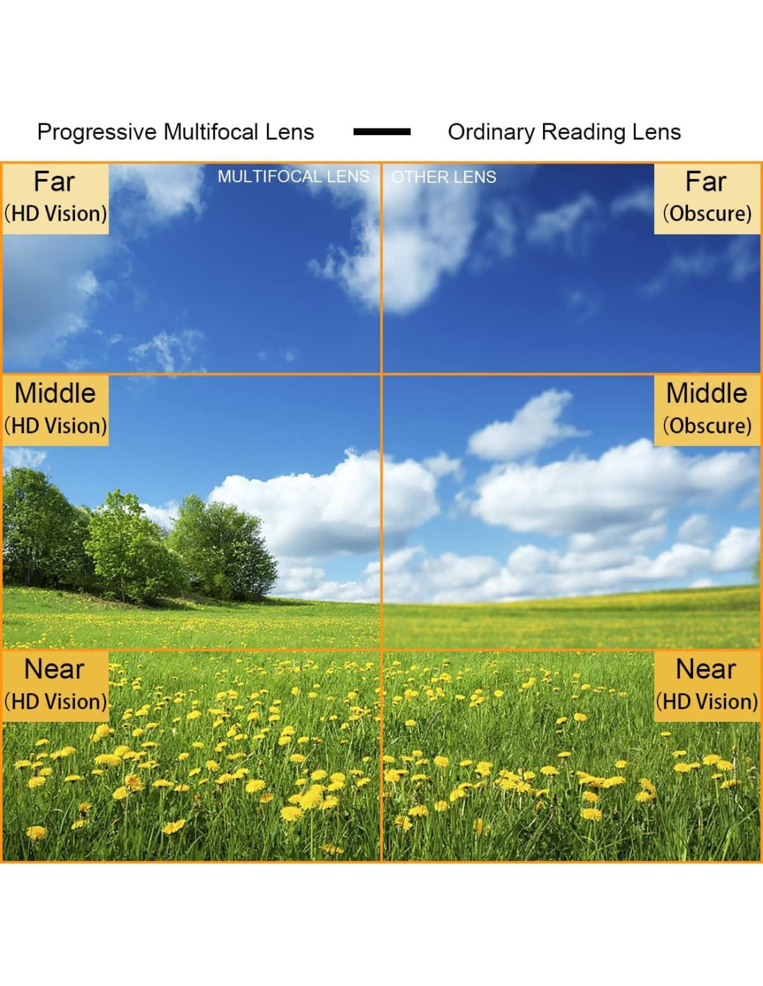Gafas multifocales progresivas adecuadas para leer y mirar objetos lejanos sin necesidad de quitárselas con frecuencia. Lentes progresivas inteligentes con zoom. Adecuadas para leer, caminar u otras actividades al aire libre sin necesidad de quitárselas con frecuencia. Consejos útiles: 1. Si es la primera vez que usa gafas multifocales progresivas, tenga en cuenta que la mayoría de las personas necesitan alrededor de una semana para adaptarse a usarlas, pero el tiempo de adaptación varía de persona a persona. Por lo tanto, recomendamos que no intente usar las gafas por más de 1 hora al día en los primeros tres días después de recibirlas. Desde el cuarto día hasta el séptimo, puede usarlas por más de 1 hora al día según la situación, y puede usarlas el octavo día según la situación real. 2. Dado que ambos lados de la lente son obstáculos para el astigmatismo, necesita mover la cabeza y los ojos para ver claramente los objetos a ambos lados. Si mira estas áreas, sus ojos pueden distorsionarse y puede sentirse incómodo. Precauciones: Por favor, use detergente neutro o agua jabonosa para limpiar, luego seque suavemente con un paño limpio para gafas. Cada par de gafas se revisa manualmente. Prohibimos absolutamente que productos defectuosos se mezclen. En caso de cualquier problema, háganoslo saber. Le ayudaremos a resolver el problema hasta que esté satisfecho. LENTES BLOQUEADORAS DE LUZ AZUL La exposición prolongada a la luz azul puede provocar fatiga ocular digital. Al usar sus gafas de luz azul, no más ojos cansados. Reduce la tensión ocular y la sensibilidad a la luz al enfrentar pantallas digitales. Ideal para trabajadores de oficina o cualquier persona que tenga que mirar pantallas todo el día. ¿POR QUÉ NECESITAMOS FILTRAR LA LUZ AZUL? La mayor parte de la luz azul que emiten las pantallas digitales (computadoras, laptops, teléfonos inteligentes, etc.) perjudica nuestras vidas. MANERA DE PREVENIR RAYOS AZULES DAÑINOS Las gafas bloqueadoras de luz azul LJIMI pueden obstruir eficazmente los rayos azules dañinos, la radiación de ondas electromagnéticas y los rayos ultravioleta, protegiendo los ojos del síndrome visual por computadora (fatiga ocular, visión borrosa, etc.). Visión clara continua durante todo el proceso: Debido a que el valor agregado aumenta continua y gradualmente en el área de gradiente, los usuarios pueden obtener una visión clara continua desde el punto lejano hasta el punto cercano a través de las lentes en la posición ocular adecuada. Este diseño se ajusta a la óptica fisiológica y tiene mejor adaptabilidad. La apariencia es mejor que la de las gafas de lectura de doble y triple enfoque. No hay línea de subdivisión ni área ciega anular. Son muy adecuadas para personas que necesitan mirar a la distancia, al medio y al cerca.