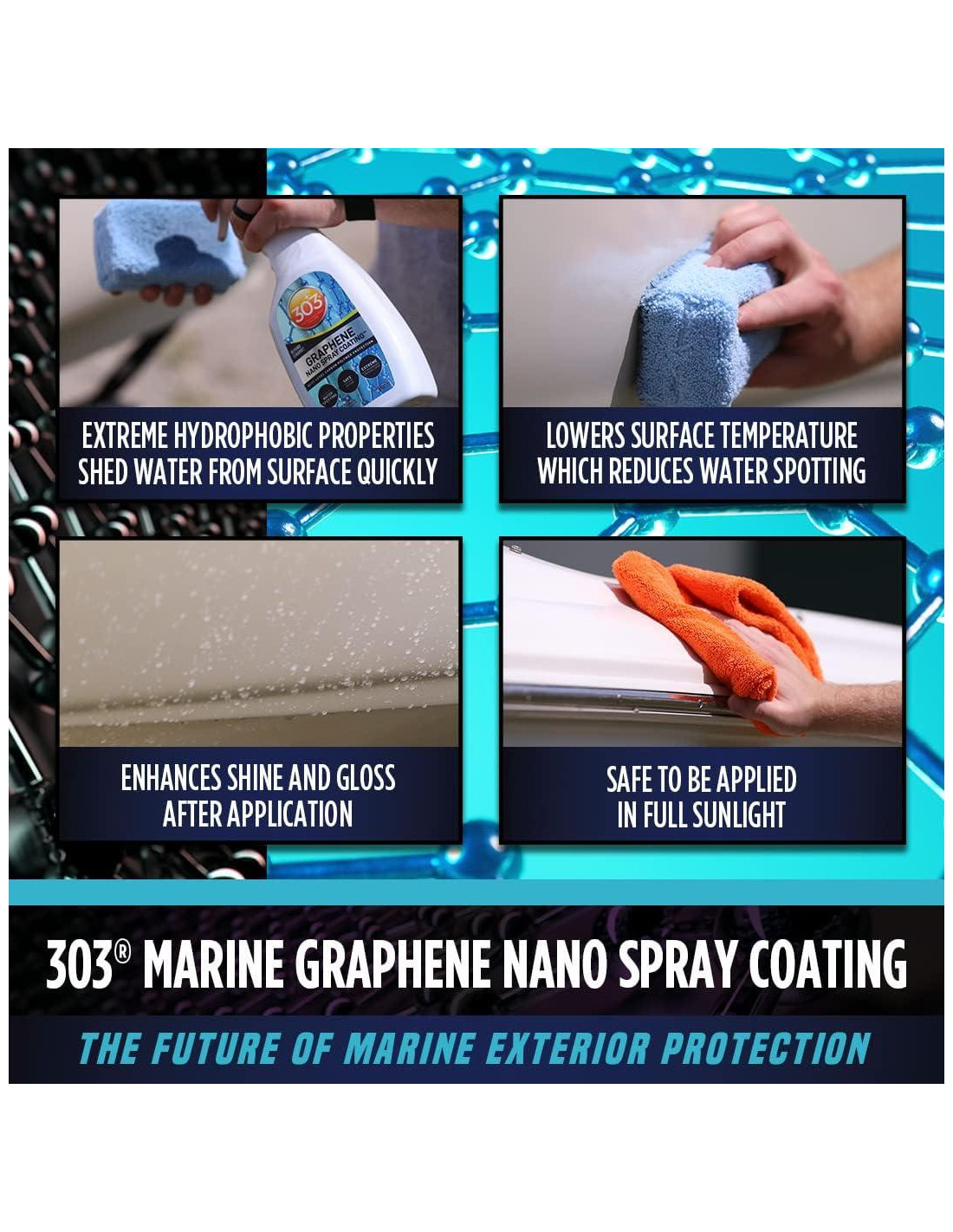 - Más Allá de la Cerámica - 303 Recubrimiento Nano Spray de Grafeno Marino ofrece más de un año de protección superior para mantener tu barco luciendo lo mejor posible. Esta fórmula fácil de aplicar aumentará la durabilidad y longevidad de la pintura, molduras y ventanas de tu barco más eficazmente que los recubrimientos cerámicos.