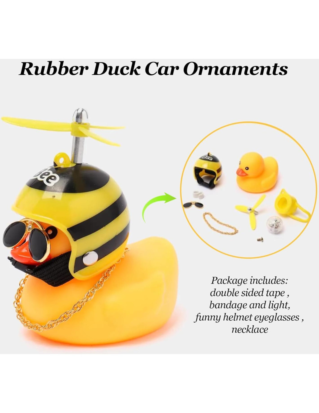 - Diseño Único Este pato amarillo está equipado con un casco divertido, gafas, collar, cinta adhesiva de doble cara, cinturón y luz, el pato genial puede aliviar la fatiga y agregar diversión a nuestra conducción.