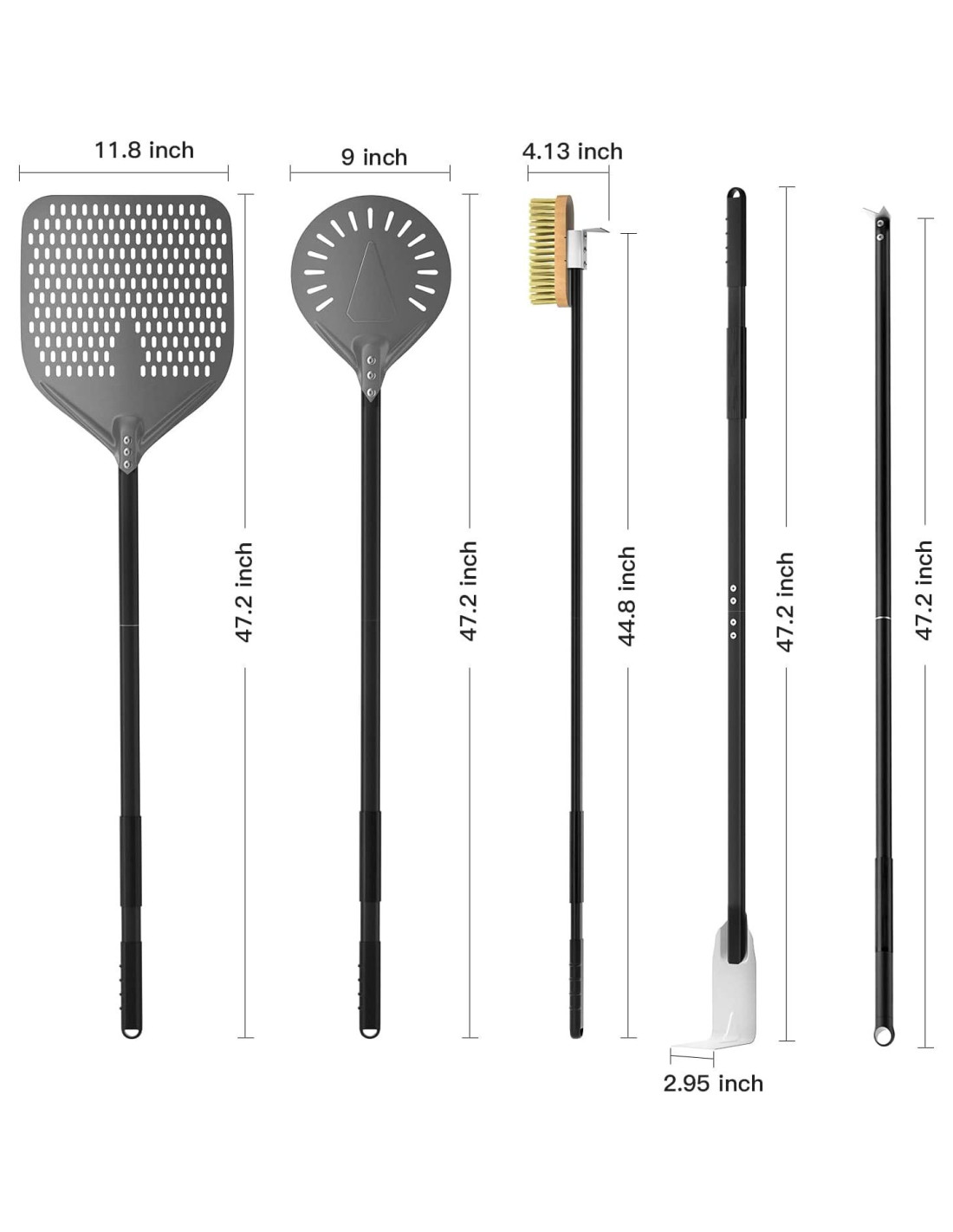- KIT VERSÁTIL PARA HACER PIZZA: Este conjunto de 5 herramientas para pizza es esencial para entusiastas de la pizza, panaderos caseros y profesionales. El kit incluye una paleta rectangular de aluminio de 12" (30.48 cm) x 15" (38.1 cm), una paleta redonda de aluminio de 9" (22.86 cm), un cepillo de cerdas de latón ajustable, un rastrillo de ceniza de aluminio y un tenedor para pizza de acero inoxidable.