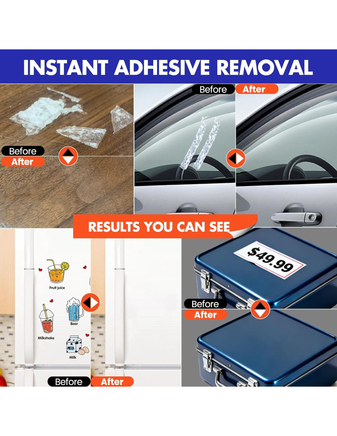 - Fórmula Segura y No Dañina: Este removedor de pegamento está diseñado con una fórmula segura para superficies que elimina residuos sin rayar ni decolorar. Suave con acabados delicados pero fuerte con adhesivos; restaura superficies a condiciones como nuevas sin riesgo de daño.