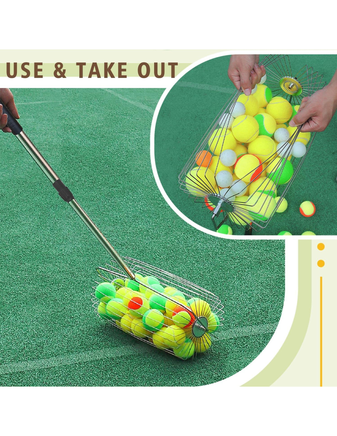 - El recolector de pelotas de tenis es ligero y portátil. Cuando no lo estés usando, puedes quitar la varilla para un fácil almacenamiento, no ocupa mucho espacio. El recogedor de pelotas es adecuado para su uso en varias canchas de tenis