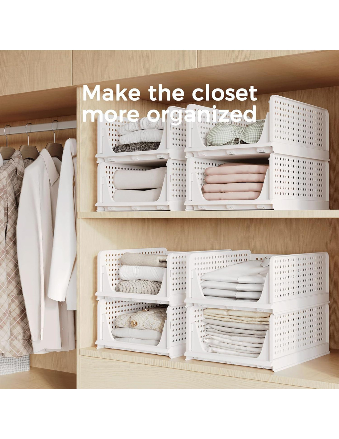- [Fácil de Montar y Apilable] : Fácil de montar, sigue los pasos en las imágenes. Ajusta a tu propio gusto apilando el número perfecto para adaptarse a tu espacio. El conjunto de 4 organizadores de ropa para armario se puede apilar, lo que hace que el espacio en casa esté organizado, maximizando el uso del espacio vertical. Puedes apilar organizadores de almacenamiento de armario de múltiples capas según tus necesidades libremente.