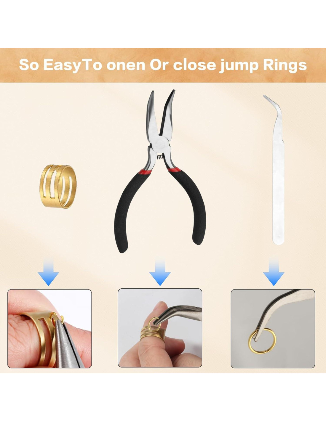 - Fácil de operar: equipado con pinzas de punta doblada, tijeras, anillas y otras herramientas. Simplemente sujeta un extremo de la anilla de salto con las pinzas, inserta el otro extremo en la abertura del anillo en tu mano, y luego úsalo en la dirección opuesta para comenzar tu reparación de joyería.