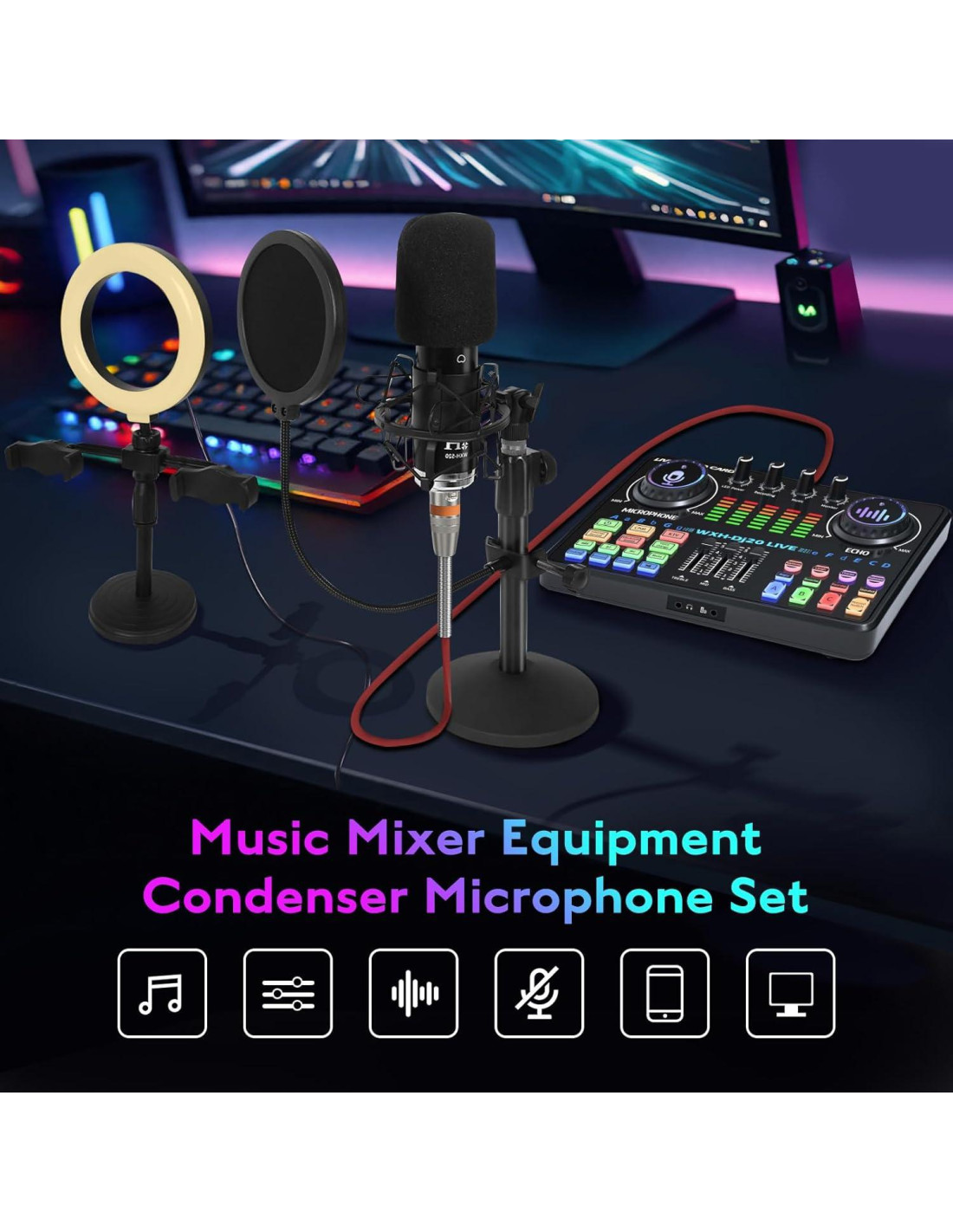 - [Paquete de Equipos de Podcast Profesional] El paquete de equipos de podcast está equipado con micrófono de podcast WXH520, soporte de escritorio, red anti-spray, disco metálico grande, luz de relleno de color y tarjeta de sonido Dj20. Un conjunto puede satisfacer todas tus necesidades y no necesitas comprar otro equipo nuevamente