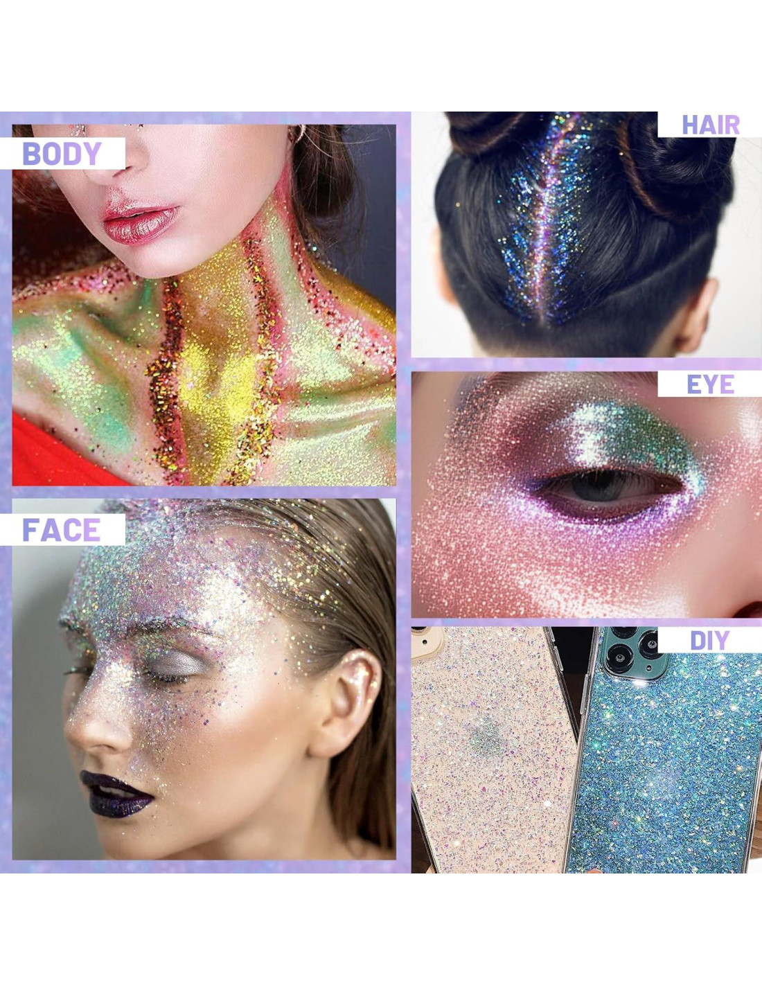 - [Colores de Brillo Holográfico] De colores brillantes y claro para aplicar, este brillo para el cabello se puede aplicar suavemente en la piel para producir un efecto muy brillante. Los lentejuelas están disponibles en seis colores holográficos, perfectos para atuendos de fiesta rave. Los colores de brillo fino y el brillo cambian con el ángulo de visión, haciéndote el fan más visible en el concierto.