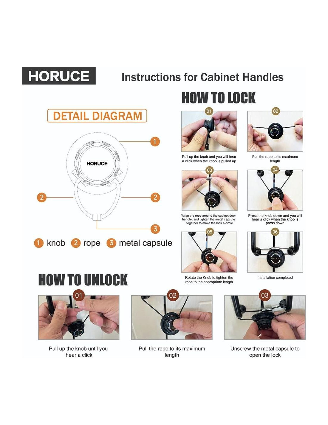 Cada bebé es un ángel, pero cuidar de los ángeles no es fácil. Esperamos que nuestro bebé pueda explorar valientemente el mundo, pero también nos preocupa los peligros potenciales. Por lo tanto, establecimos la marca HORUCE, inspirada en la deidad guardiana de los niños en la mitología egipcia - HORUS. Simboliza vitalidad, coraje. Esto es lo que esperamos traerles a través de nuestros productos de seguridad infantil. Protejamos juntos el hermoso comienzo de la vida de nuestro bebé. perilla: Tire hacia arriba para desbloquear la cuerda. Presione hacia abajo para bloquear la cuerda. Apriete la cuerda girando la perilla. Suelte la cuerda tirando de la perilla cápsula de metal: Atornille la cápsula de metal para conectar la cuerda. Desatornille la cápsula de metal para desconectar la cuerda. Estas cerraduras de gabinete pueden ayudar a prevenir que sus pequeños alcancen los gabinetes de la cocina, refrigeradores de lado a lado, armarios, puertas de almacenamiento y mantenerlos fuera de problemas, se pueden aplicar en la cocina, baño, despensa, dormitorio, etc.; Nuestras cerraduras de gabinete, reutilizables y convenientes, son adecuadas para todo tipo de perillas y mangos, manteniendo a los bebés curiosos y a las mascotas activas alejados de los gabinetes. Tire hacia arriba de la perilla y escuchará un clic cuando la perilla se levante. Tire de la cuerda hasta su longitud máxima. Envuélvala alrededor de las perillas de las puertas del gabinete y apriete la cápsula de metal juntas para hacer un círculo con la cuerda. Presione la perilla hacia abajo y escuchará un clic cuando la perilla se presione hacia abajo. Gire la perilla para apretar la cuerda a la longitud adecuada. Instalación completada. Tire hacia arriba de la perilla hasta que escuche un clic. Tire de la cuerda a una longitud mayor que la distancia entre las perillas. Retire la cuerda de las perillas directamente. Tire hacia arriba de la perilla y escuchará un clic cuando la perilla se levante. Tire de la cuerda hasta su longitud máxima. Envuélvala alrededor del mango de la puerta del gabinete y apriete la cápsula de metal juntas para hacer un círculo con la cuerda. Presione la perilla hacia abajo y escuchará un clic cuando la perilla se presione hacia abajo. Gire la perilla para apretar la cuerda a la longitud adecuada. Instalación completada. Tire hacia arriba de la perilla hasta que escuche un clic. Tire de la cuerda hasta su longitud máxima. Desatornille la cápsula de metal para abrir la cerradura.