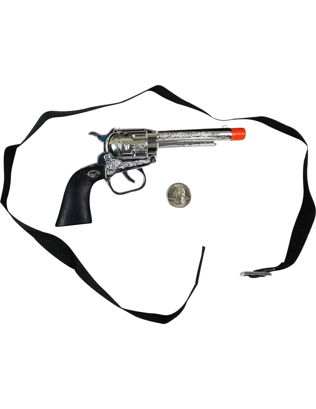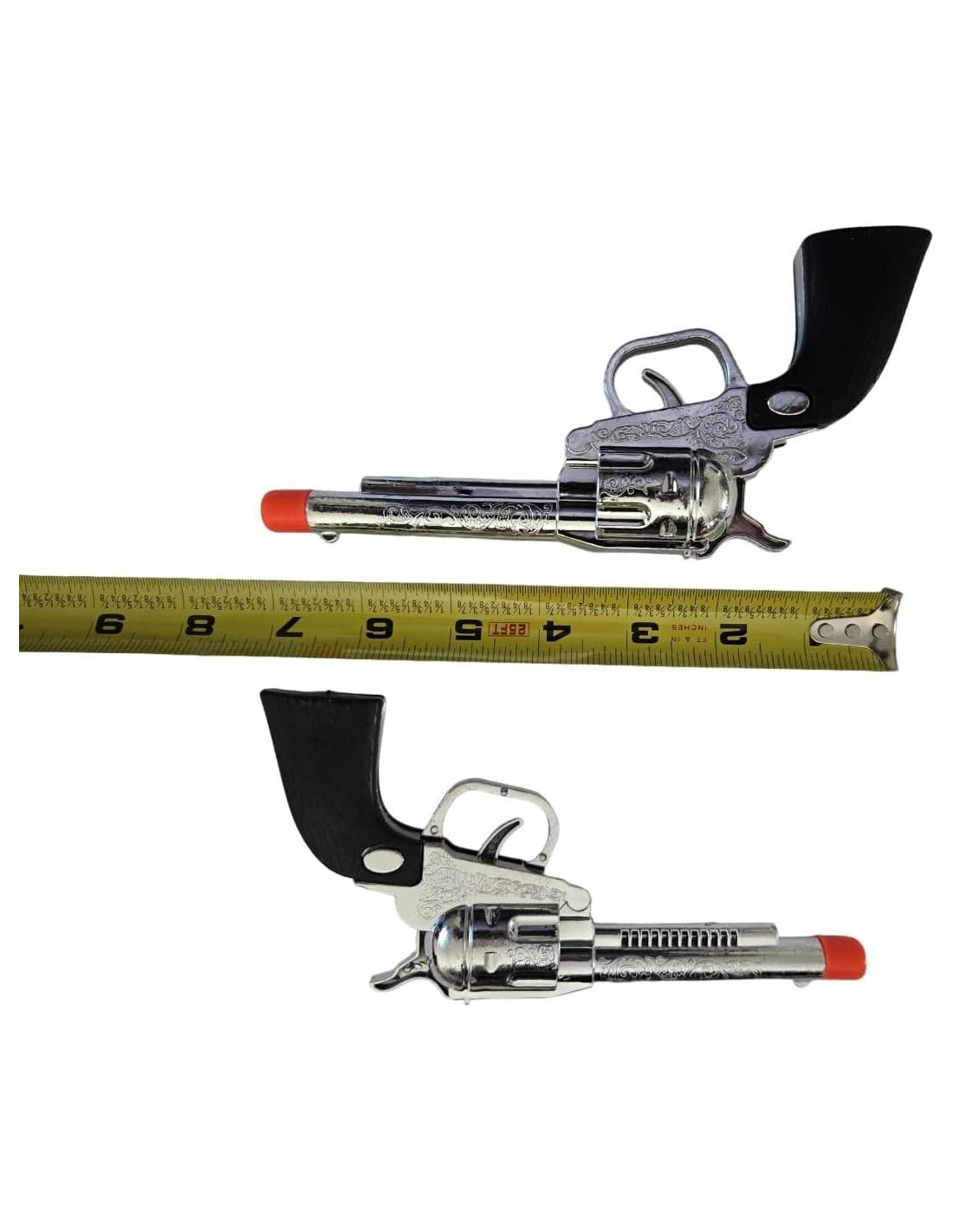 - Conjunto de lujo de 8 piezas incluye 2 pistolas de juguete de acción por clic con 2 fundas, 2 insignias, 1 bandana roja de paisley, un cinturón de 30" x 5/8" (76.2 cm x 1.59 cm) para llevar las fundas