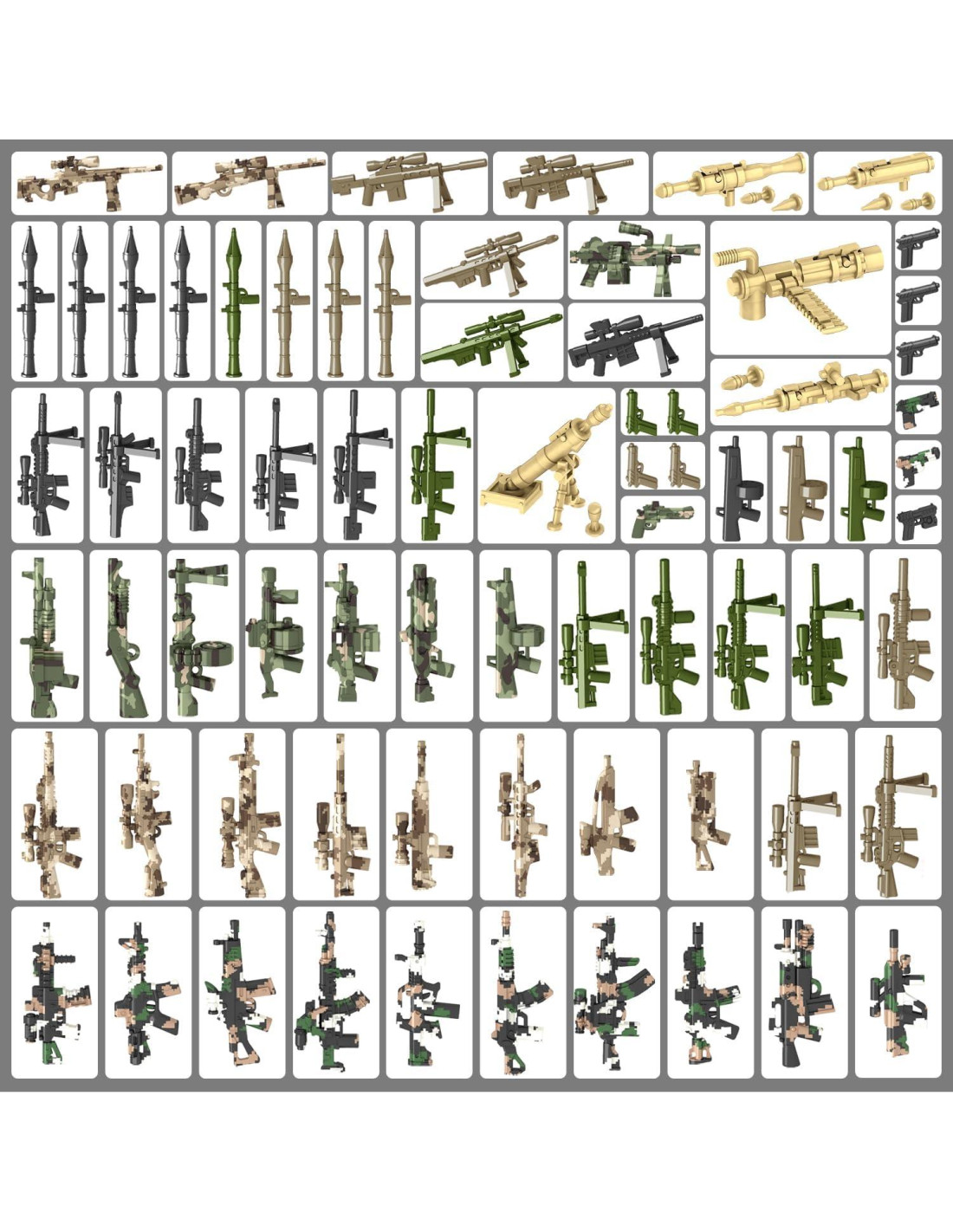 - [Embalaje] Los accesorios del paquete de armas son como se muestra en la imagen, incluyendo dispositivos de visión nocturna para personajes de policía/SWAT/militares, paracaídas, vehículos todoterreno, cajas de armas, cajas médicas, cercas defensivas, chalecos antibalas, trajes de desactivación de bombas, dos tipos de escudos, múltiples rifles de camuflaje, múltiples ametralladoras, múltiples pistolas, granadas, botellas de aceite, barriles de aceite, sacos de arena, Gatling, ametralladoras Maxim, así como herramientas como palas, alicates, bayonetas, linternas, hachas, etc.