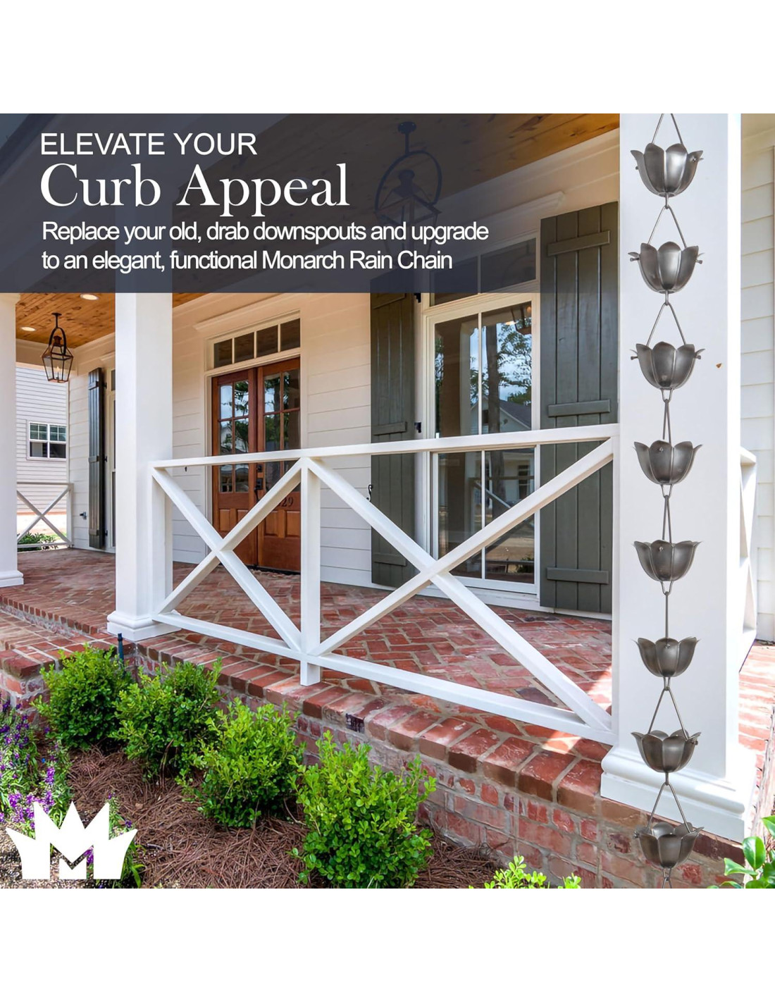 - GESTIÓN EFICAZ DEL AGUA DE LLUVIA: Esta cadena de lluvia de 2.6 metros incluye un colgador triangular de 12.7 cm y está diseñada con una boca ancha y acampanada para capturar eficientemente la mayor parte del agua de lluvia con pétalos ligeramente hundidos y definidos. Diseñada para un flujo de agua suave y fácil instalación sin herramientas como alternativa a los bajantes.