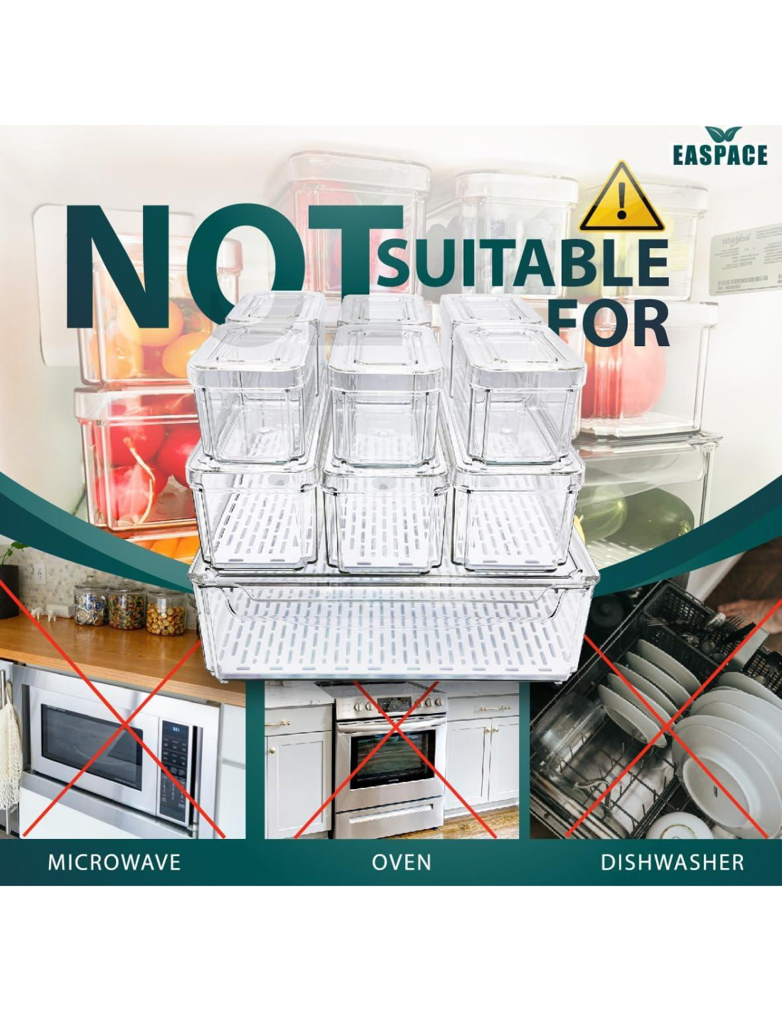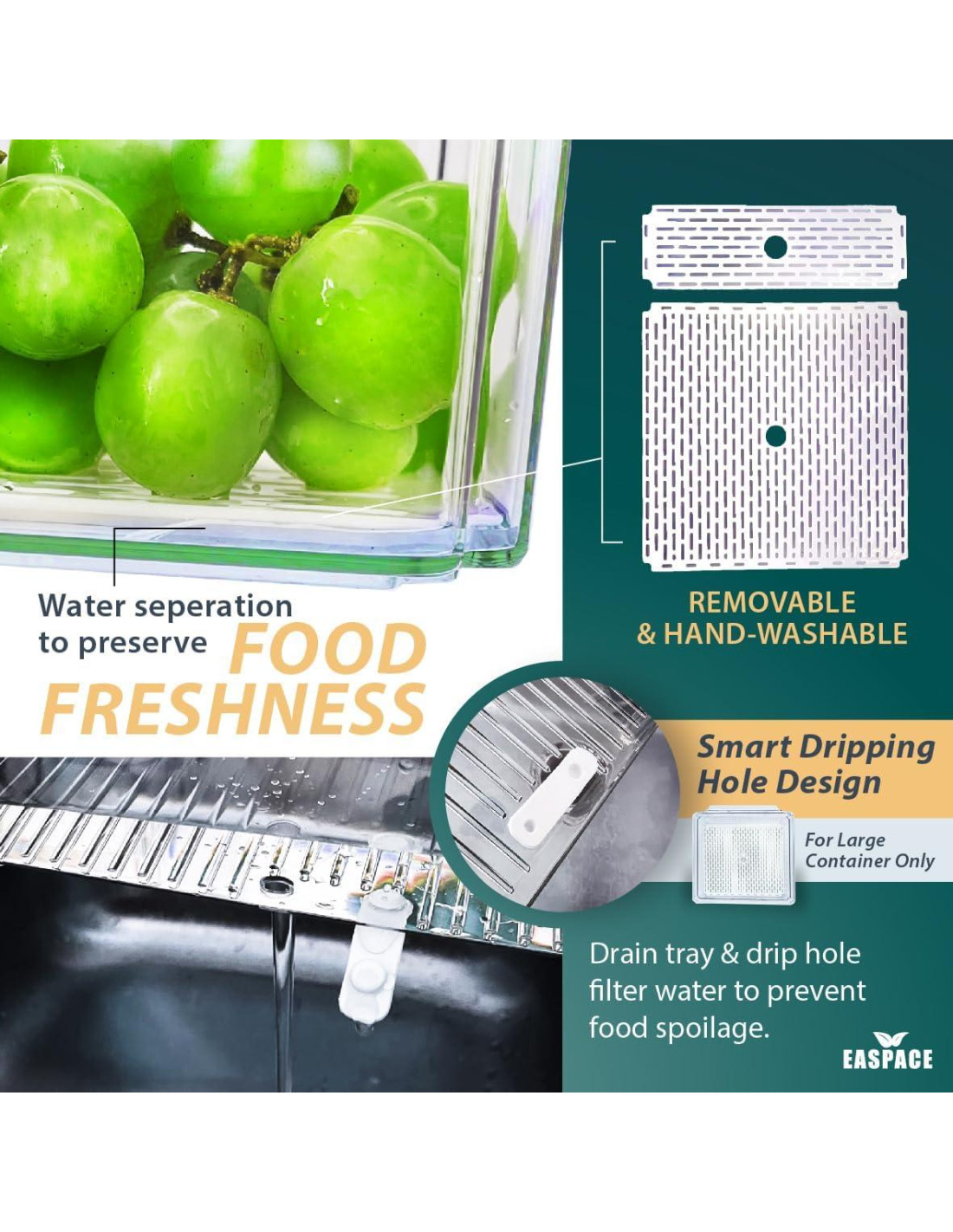 Mantén tu cocina organizada y los alimentos más frescos con el Juego de Organizadores para Refrigerador EASPACE de 10 piezas. Transforma tu refrigerador con este inteligente juego de 10 piezas que incluye: 1 Contenedor Grande (220 oz) (6,24 L), 3 Contenedores Medianos (51 oz) (1,51 L), 6 Contenedores Pequeños (16 oz) (0,47 L). Cada contenedor está hecho de plástico PET de grado alimenticio y libre de BPA, duradero, reutilizable y cristalino para una fácil visualización. Características Clave: Sistema de Bandeja de Drenaje - Mantiene la humedad alejada para extender la frescura de los alimentos. Diseño Apilable - Ahorra espacio en tu refrigerador o despensa. Multiuso - Perfecto para organizar bocadillos, bebidas, frutas y más. También puedes usarlo para tu despensa, encimera, gabinete de cocina, oficina, baño, garaje y más. Solo Lavado a Mano - No es seguro para lavavajillas, microondas u horno. Ya sea que estés preparando comidas, organizando o reduciendo desperdicios, EASPACE ayuda a mantener tu cocina limpia, ordenada y eficiente.