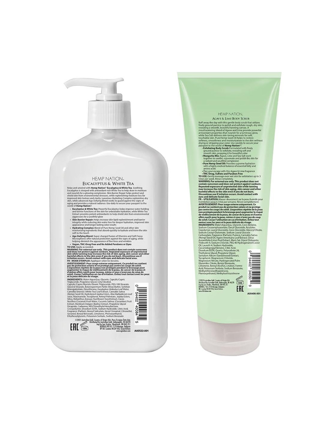 - PIEL SUAVE Y LUJOSA - Relájate y desconéctate con el Paquete de Eucalipto y Té Blanco de Hemp Nation. Incluye una loción corporal hidratante para reponer la pérdida de humedad y un exfoliante corporal de Agave y Lima para una base impecable y piel suave al tacto