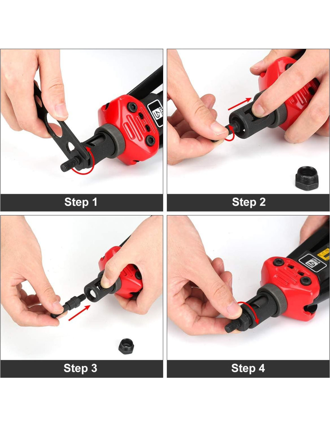 - MECANISMO INNOVADOR - Operación sin herramientas para cambiar la cabeza. La base interna roscada y la funda hexagonal bloquean firmemente el mandril durante el remachado.