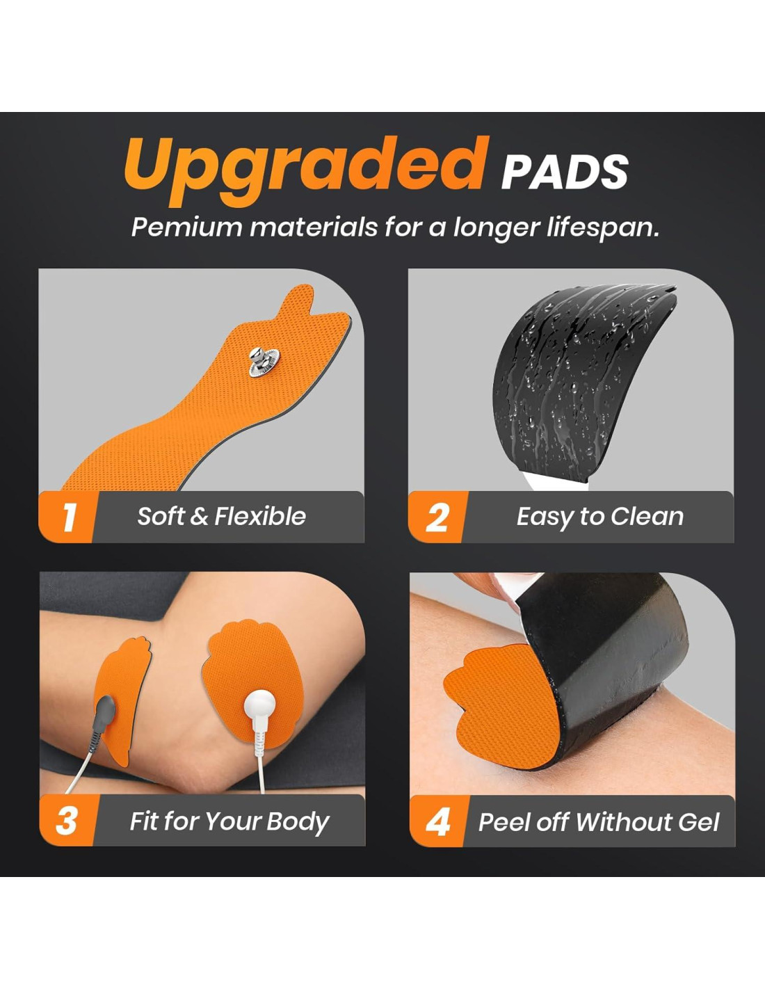 - Reutilización Más de 50 Veces: Los pads de electrodos de la unidad TENS utilizan gel americano líder en la industria para asegurar una excelente y duradera adherencia, lo que permite que los pads de estimulación tengan una vida útil más larga de más de 50 reutilizaciones. Los pads de reemplazo TENS son fáciles de quitar sin gel residual en tu piel.