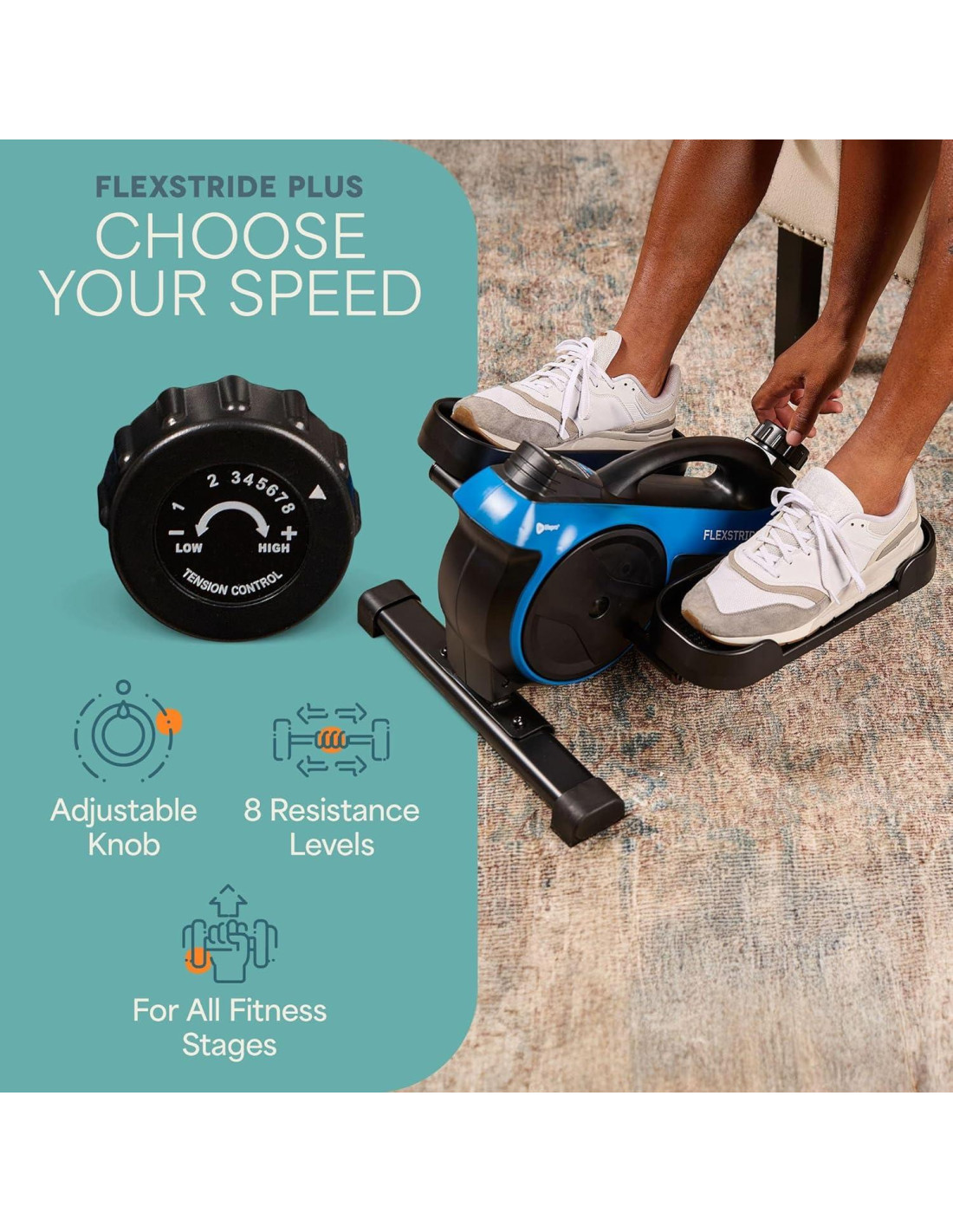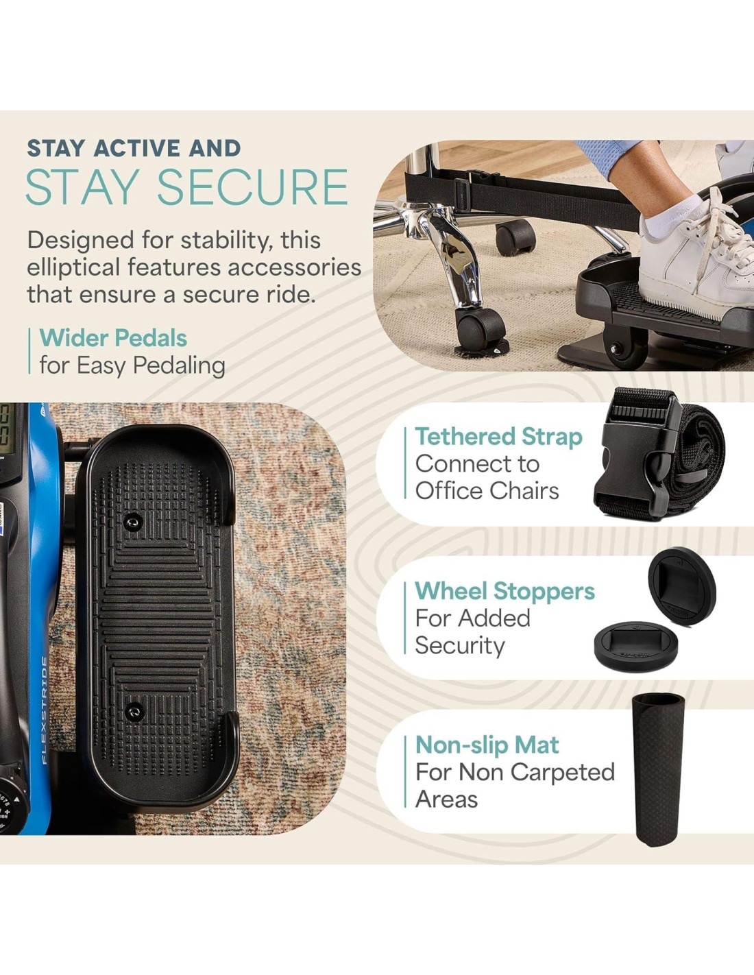 - No Más Ejercicio Inestable: Nuestro FlexStride Plus portátil viene con; tapete de yoga y banda de resistencia para usar con tu ejercitador de piernas elíptico para objetivos de fitness, paradas de ruedas para sillas inestables y correas para asegurar el ejercitador de pedales estacionario a tu silla
