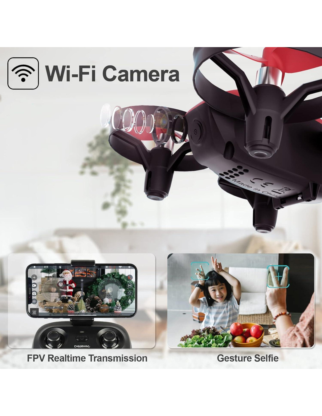 - Transmisión WiFi FPV y Control por APP: Cámara WiFi incorporada para disfrutar de un video en vivo y fotos en tiempo real en tu teléfono. Actualizado con función de Selfie por Gestos, puede tomar fotos automáticamente con gestos específicos.