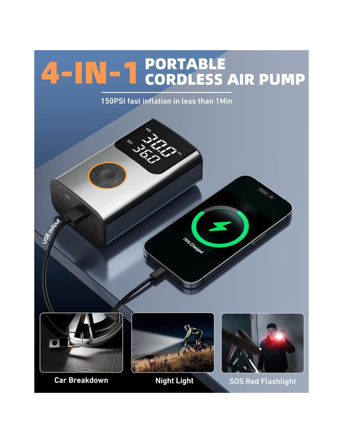 - Salida Potente y Inflado Más Rápido Este Compresor de Aire motor potente puede proporcionar 150PSI de presión, y 36 L/min de flujo de aire. Neumáticos de 28-35 solo necesitan 1min, 0-36PSI solo necesitan 5 minutos para inflarse completamente. Con sus 5 modos inteligentes, se adapta sin esfuerzo a una variedad de tareas de inflado. Úsalo con bicicletas eléctricas, bicicletas, motocicletas, automóviles, pelotas, y más.