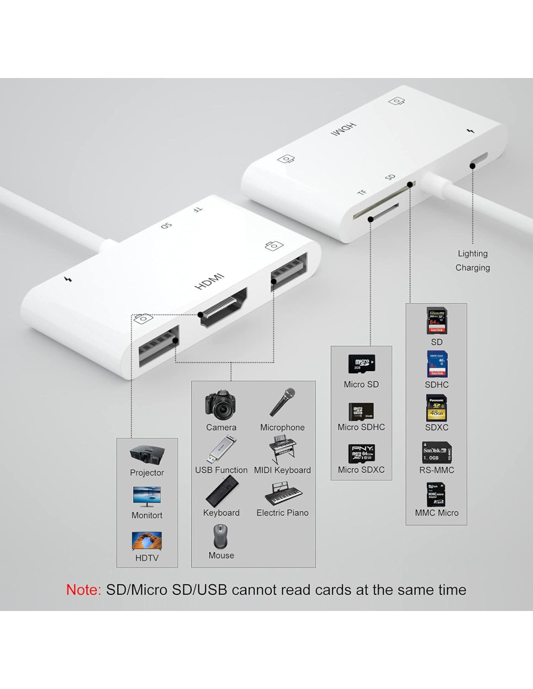 - <Adaptador de lector de tarjeta de cámara 6 en 1> ¿Demasiados adaptadores y lectores de tarjetas para llevar? No te preocupes. Solo necesitas un hub adaptador de lightning. 2 puertos USB estándar para conectar dispositivos como unidad flash o cámara o cable USB a teclado MIDI, ratón, etc. 1 puerto HDMI con salida AV digital vívida de 1080P. 2 ranuras para tarjeta SD (una Micro SD) con versatilidad superior de almacenamiento de datos, y un puerto de carga---¡todas las posibilidades en un adaptador!