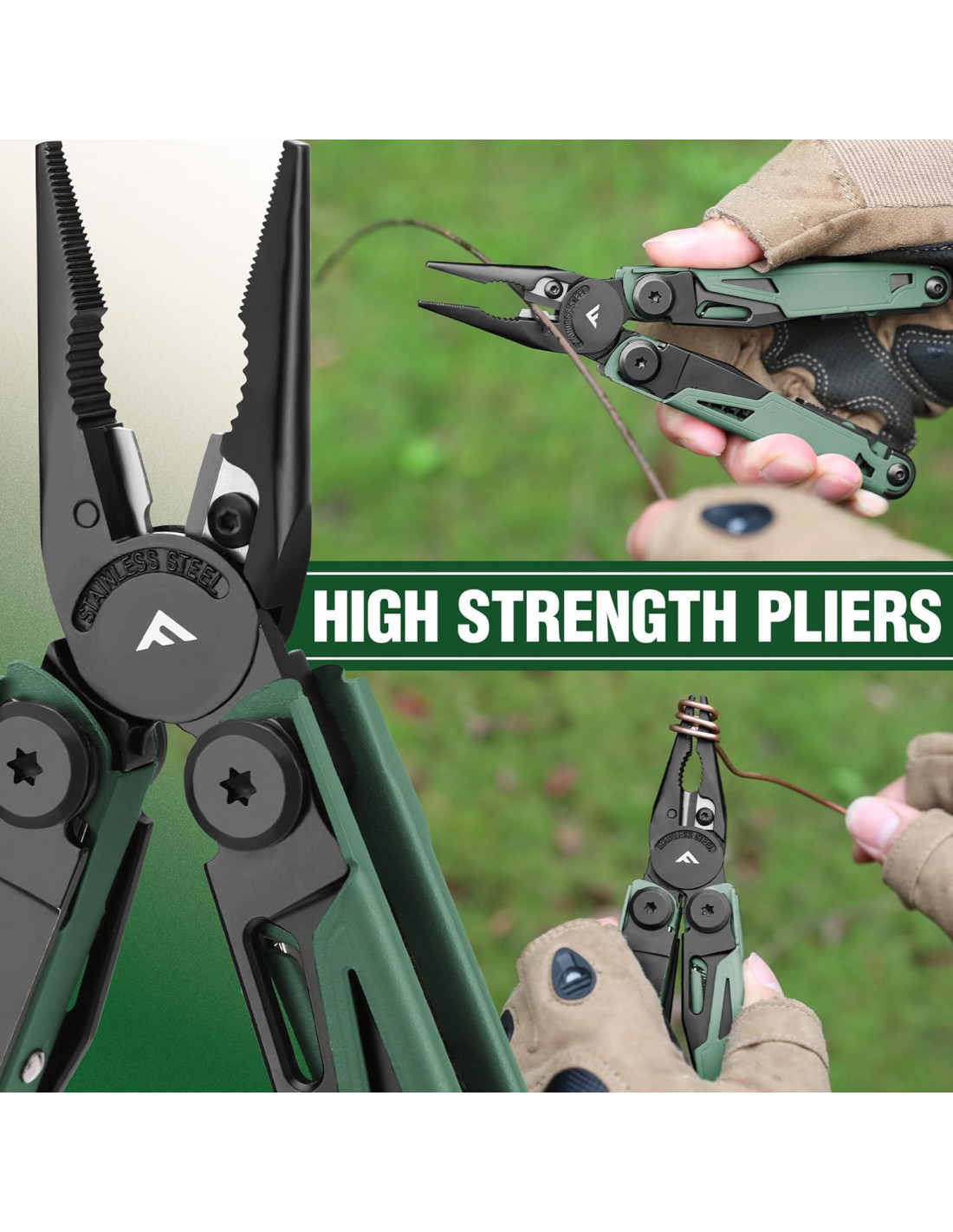 - Material portátil: Fabricada con acero inoxidable ultra duradero, esta multiherramienta de supervivencia destaca por su longevidad y resistencia a la corrosión. Acero inoxidable de alta resistencia para una durabilidad excepcional, estas multiherramientas ofrecen un uso cómodo y una apariencia visualmente impactante