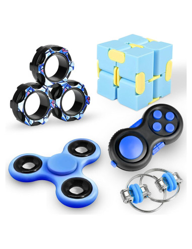 - Juego de Juguetes Sensoriales Antiestrés Este juego de juguetes para aliviar el estrés incluye un cubo infinito, 3 anillos magnéticos, un pad antiestrés, un spinner y un juguete de cadena giratoria. Varios tipos de juguetes antiestrés para ADHD te ayudan a aliviar el estrés y la ansiedad durante el trabajo, ayudan a tus hijos a mantenerse ocupados y concentrados durante el juego.