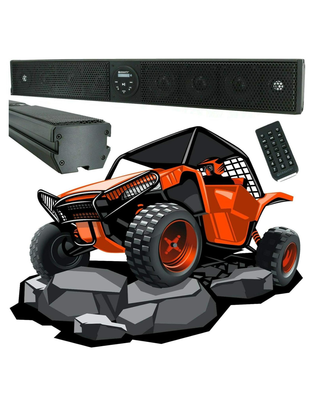 Nuevo - Gravity GTV64BT Audio Barra de Sonido Impermeable de 35" para ATVs UTVs Bluetooth + Controlador - 2da Generación Topología de amplificador SUPER HPD (Alta Potencia Digital) integrada con 30% más SPL 6 Controladores de Alta Eficiencia para manejar graves y medios Dos Tweeters de Cúpula de Titanio Puro de 1" con Imán de Neodimio para manejar altas frecuencias Entrada Bluetooth o aux de 3.5mm para permitir conexión directa desde el dispositivo Salida de audio (2 Voltios) para impulsar componentes externos Emparejamiento Seguro y Simple mantiene tu BT conectado y a nadie más Avance y Retroceso de Pista Volumen arriba y abajo Operación fácil con guantes de conducción Impermeable y a Prueba de Polvo con Certificación IPX68 Estructura de Aluminio Extrudido Sólido Tapas de Aluminio Fundido Rejilla de Impacto Pesado previene daños a los altavoces Las Barras de Sonido se integrarán perfectamente en SXS, ORV's o coches de arena personalizados Pista Ajustable para Instalación en Jaula de Rollo Detalles Técnicos: Barra de Sonido de Alta Calidad de 35.82" Potencia: 600 Watts Altavoz de rango completo de 35.82'' de alta potencia y largo alcance proporciona graves increíblemente profundos y potencia acústica Respuesta de Frecuencia: 45Hz- 22000 Hz Potencia operativa: 12VDC Fusible: 15A tipo AGC Versión de Bluetooth: 2.1 EDR A2DP Rango de Bluetooth: 33 pies Contenido del Paquete: Gravity GTV64BT Kit de montaje Adaptador de extensión de accesorio de potencia Línea de audio de 3.5 Control remoto Manual del usuario Tarjeta de garantía