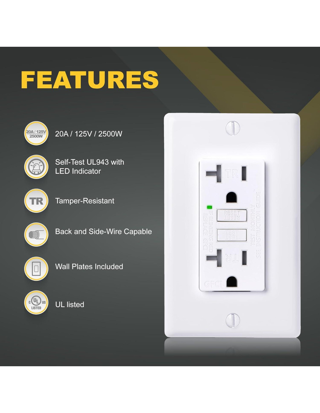 - AUTO PRUEBAS AUTOMÁTICAS: Obtén tranquilidad con las auto pruebas automáticas que aseguran que tu toma de corriente GFCI esté siempre lista para proteger. También utiliza un conveniente botón de reinicio para facilitar la solución de problemas.