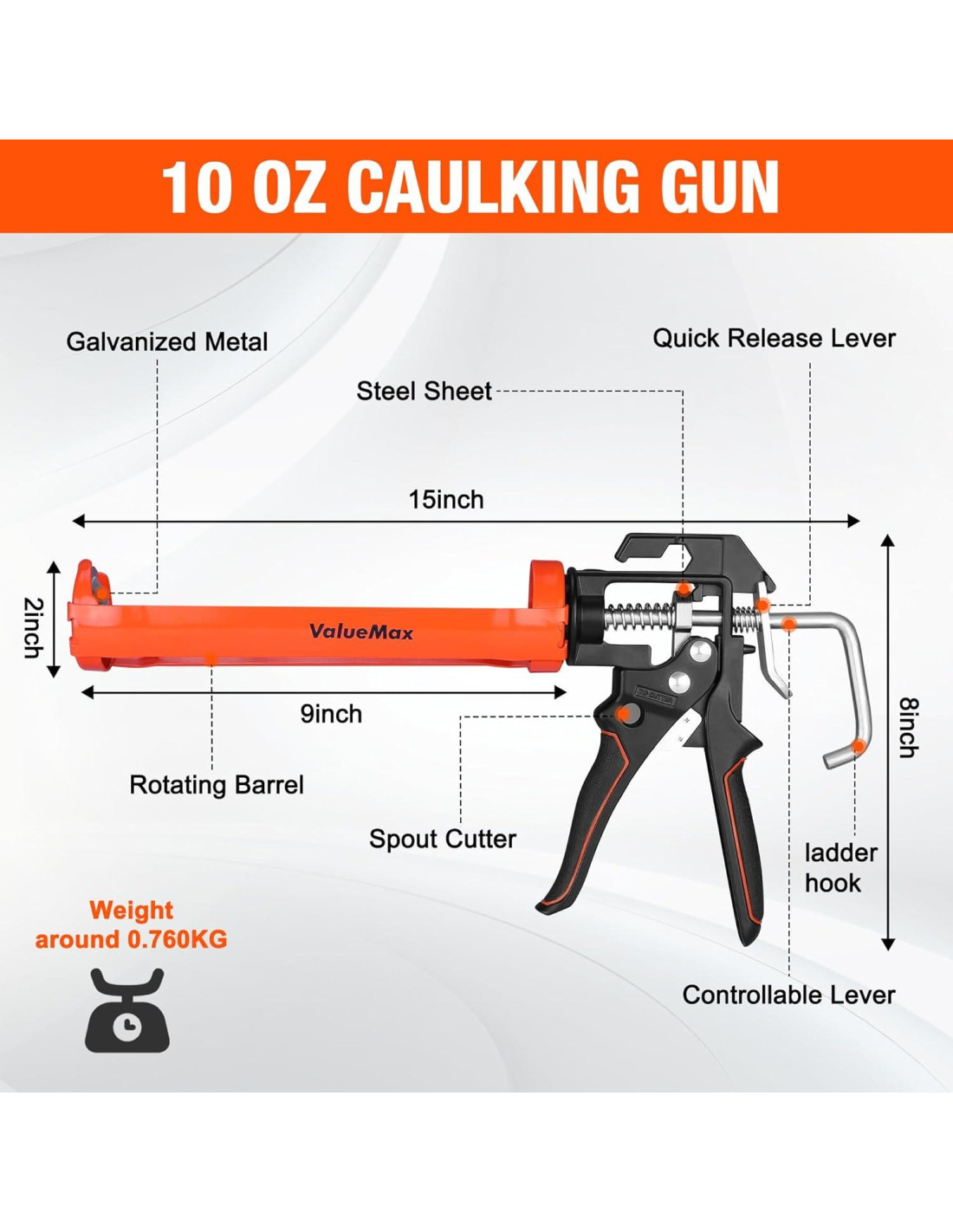 - Diseño Delicado: Un barril rotatable de 360 grados ayuda a que el proceso de uso sea más flexible, el cortador de boquilla incorporado significa que la pistola de calafateo tiene un cuchillo utilitario como bonificación, cortando la boquilla directamente. Un pin de perforación sella el líquido que sale de la boquilla. Un gatillo cubierto de goma proporciona un agarre suave, reduciendo la presión de resistencia y la fricción, lo que también protege tus manos. La parte de metal galvanizado hace un cuerpo resistente a la oxidación que prolonga la vida útil y lo hace más duradero