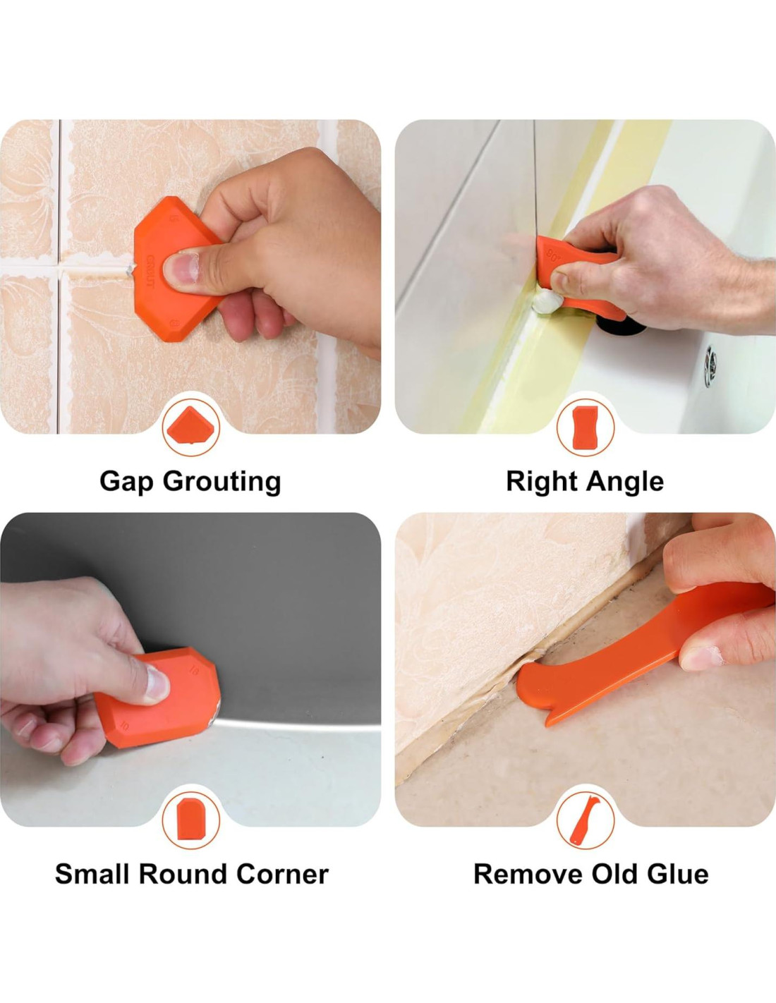 - Raspador de Múltiples Ángulos: Los kits de herramientas de acabado de calafateo con múltiples ángulos satisfacen las necesidades de varios escenarios, incluyendo suavizado de ángulos planos oblicuos de 5/8/10/16 mm, lechada de huecos y reparación de ángulos rectos. Y no dejará ninguna marca extra en la superficie