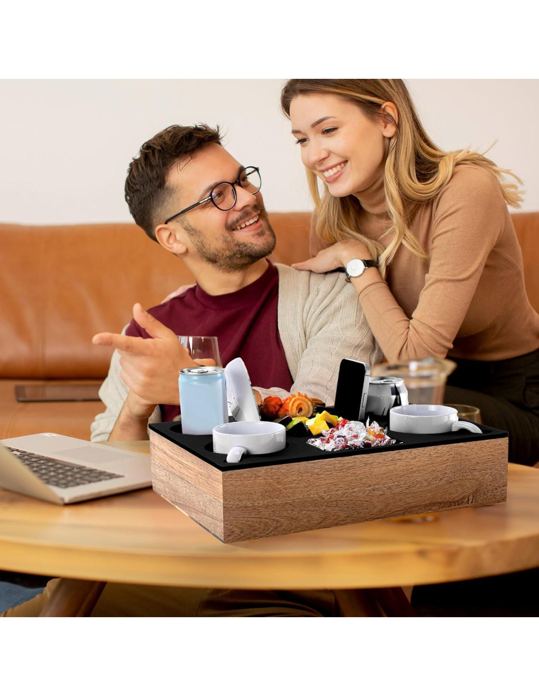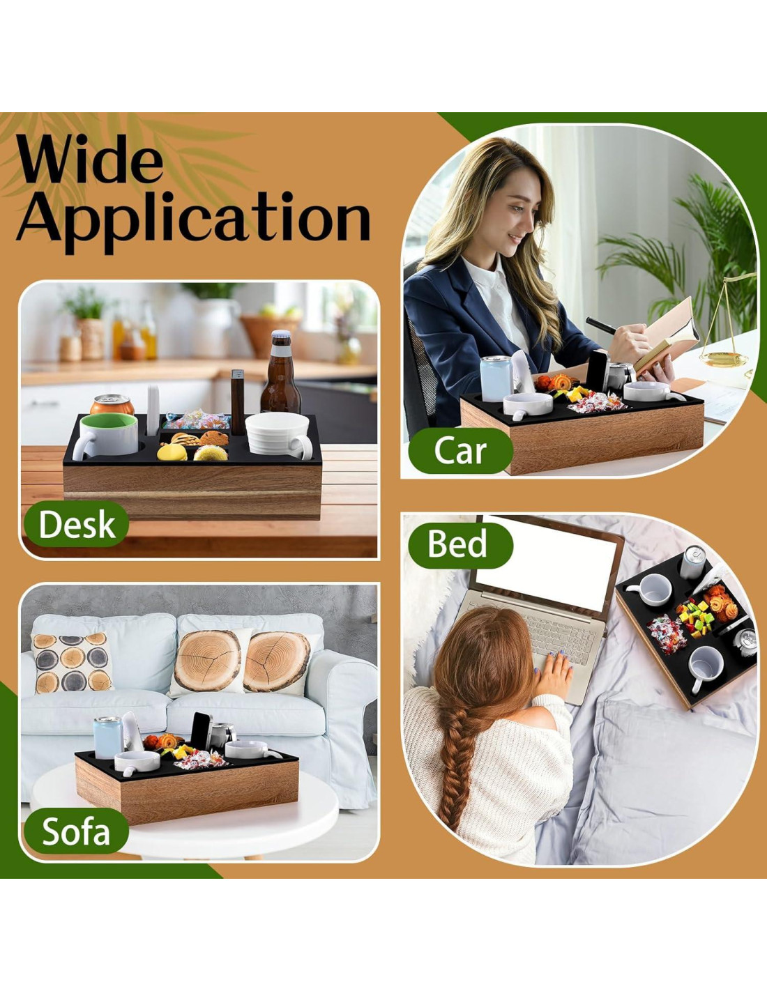 - Diseño de múltiples ranuras para tarjetas: esta bandeja para soporte de tazas de sofá está diseñada para tener una gran capacidad; hemos diseñado cuidadosamente múltiples ranuras para tarjetas, incluyendo ranuras para tazas con asas, ranuras para vasos de agua, ranuras para controles remotos, ranuras para bocadillos, etc., permitiéndote disfrutar de tu tiempo de manera más conveniente