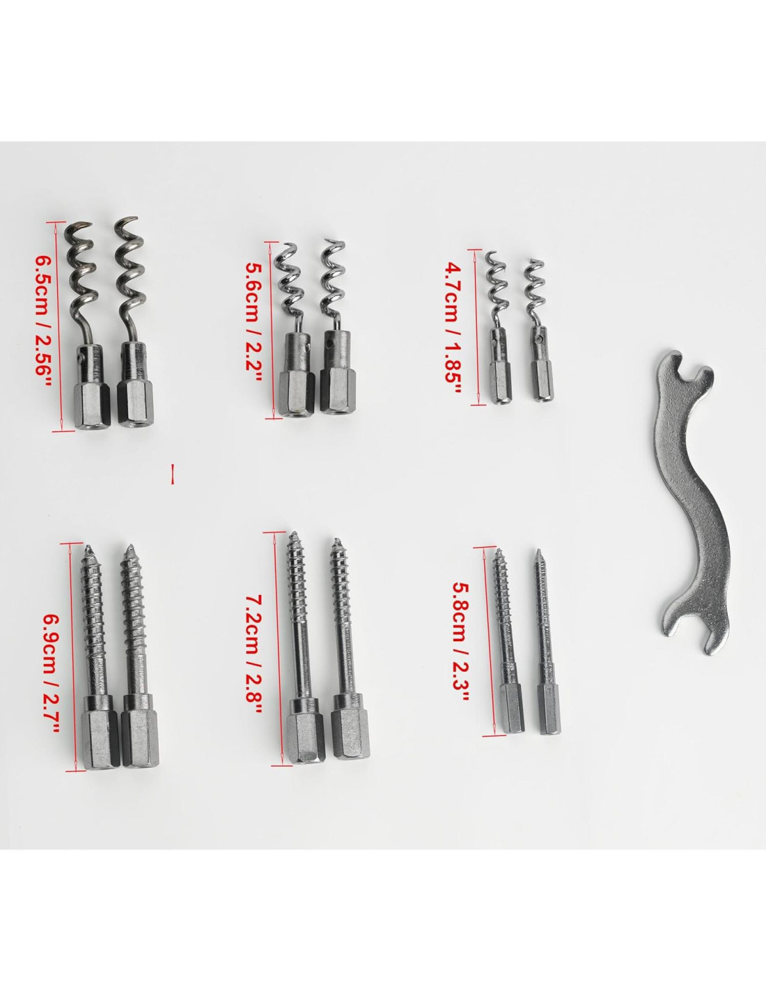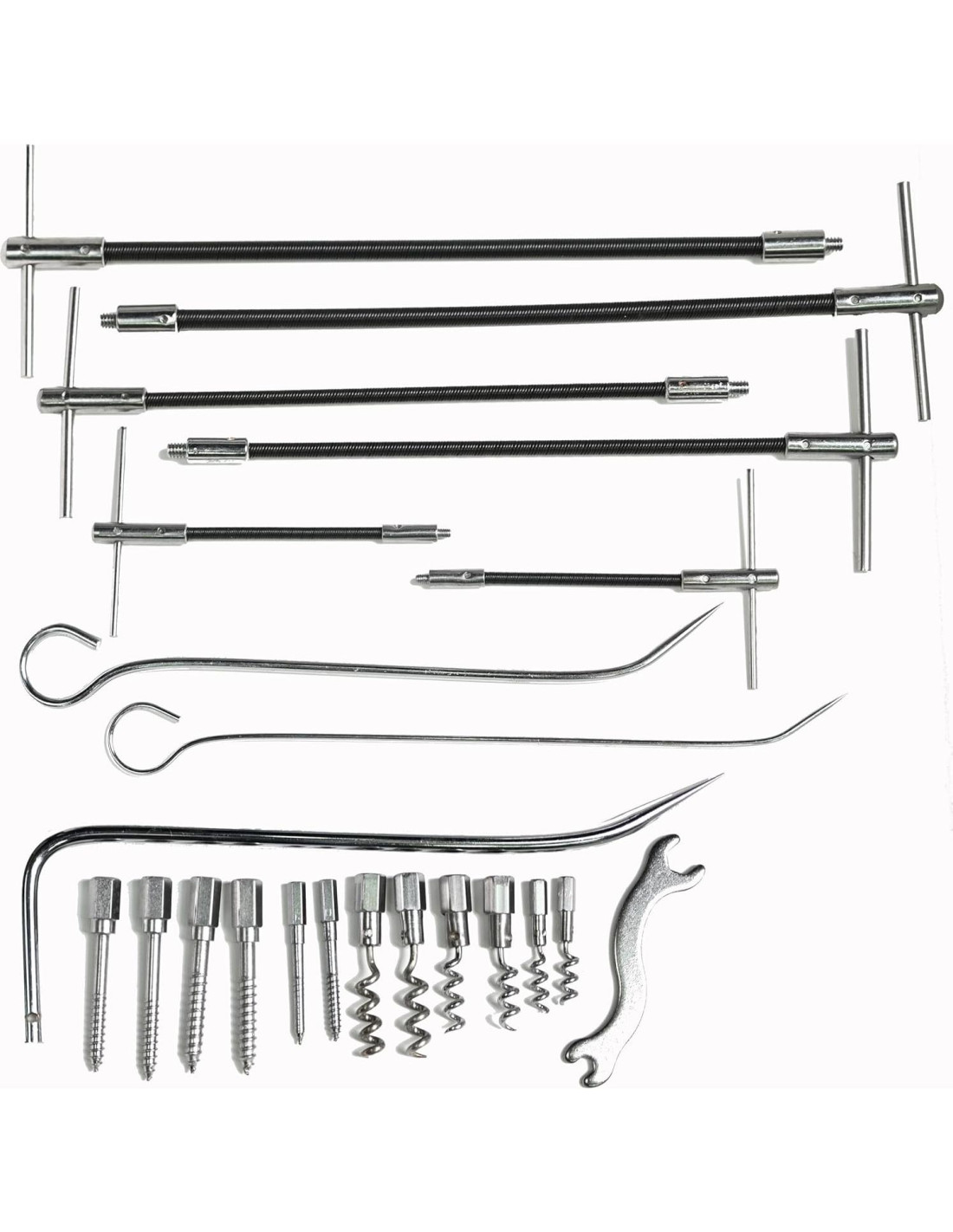 - Componentes incluidos: 2 x L7-1/2" (19,05 cm) Mango de Eje Flexible 2 x 11" (27,94 cm) Mango de Eje Flexible 2 x 14-1/2" (36,83 cm) Mango de Eje Flexible 1 x L10" (25,4 cm) Mango Rígido de 3,5 mm 1 x Mango Rígido de 5,0 mm 1 x Mango Rígido de 8,0 mm 2 x Punta de Sacacorchos L 2 x Punta de Sacacorchos M 2 x Punta de Sacacorchos S 2 x Punta de Tornillo L 2 x Punta de Tornillo M 2 x Punta de Tornillo S 1 x Llave 1 x Caja de Herramientas