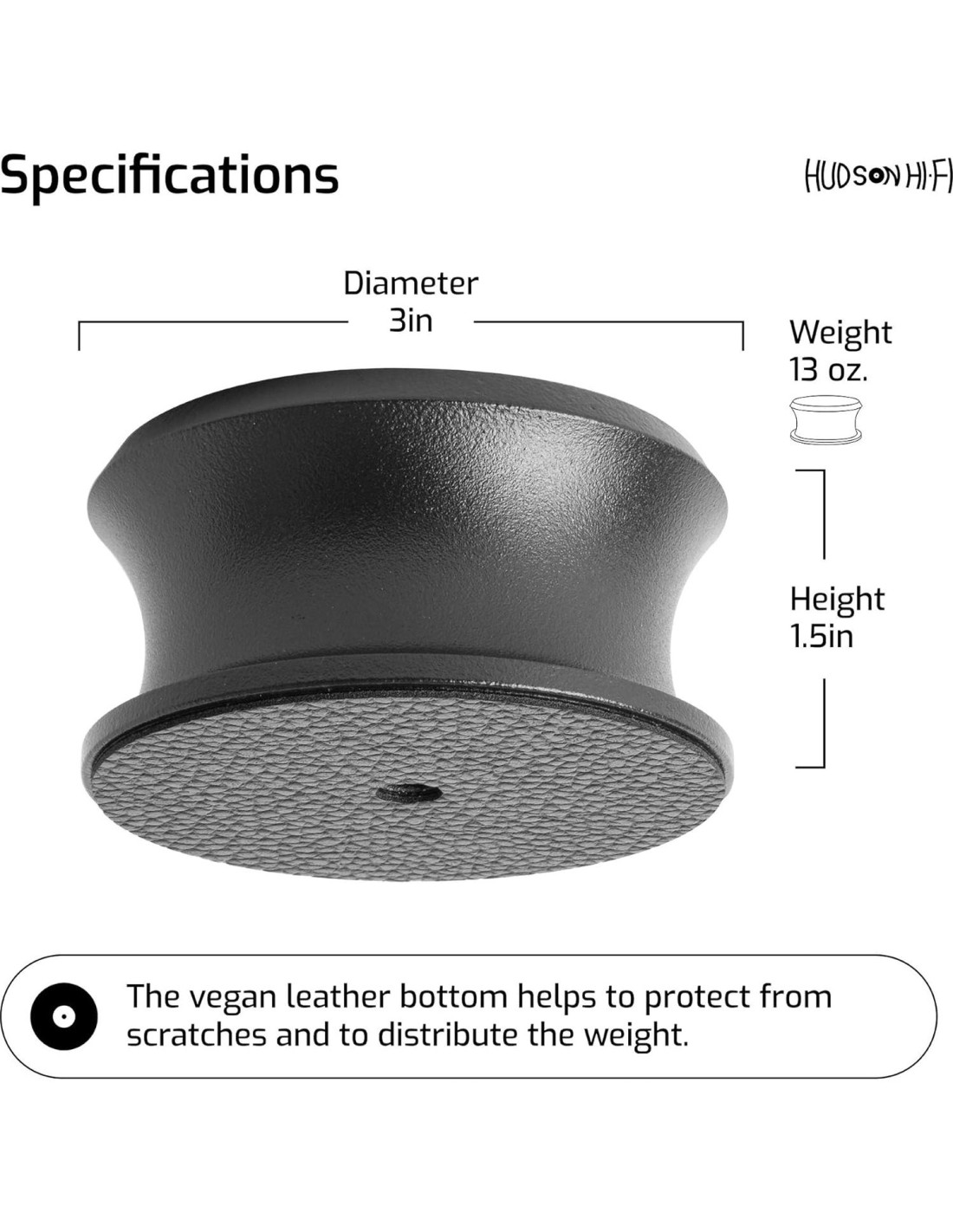 - Protege de Rayones y Asegura una Distribución de Peso Uniforme - El peso de disco de 13 onzas (368,54 g) de Hudson Hi-Fi es una excelente adición a tus tocadiscos y accesorios. Está hecho de acero sólido con un exquisito acabado en cromo y una almohadilla protectora de cuero vegano que sirve como un amortiguador entre tu disco y el peso del tocadiscos.