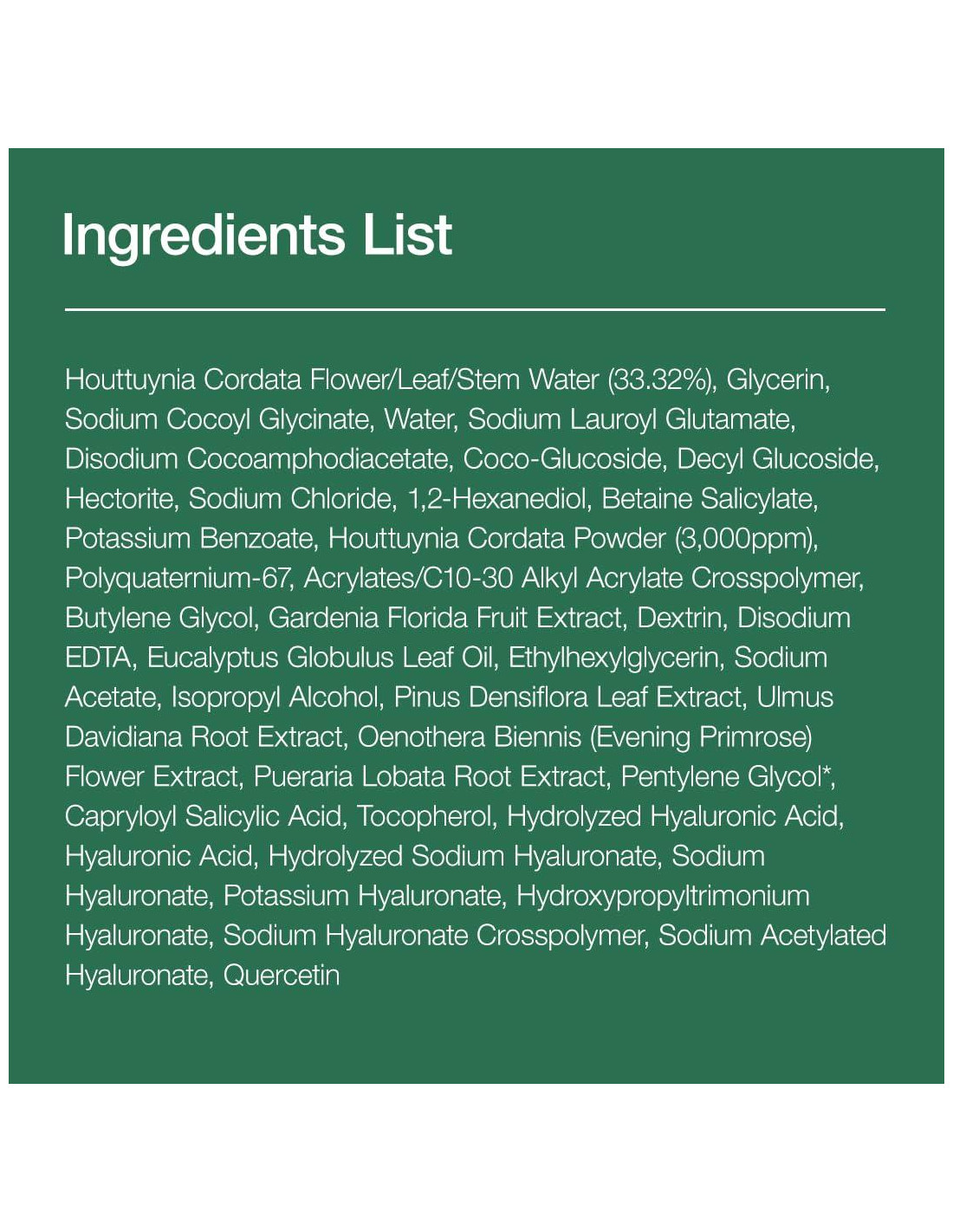 - EXFOLIACIÓN SUAVE: Contiene 3,000ppm de polvo de Hoja Corazón que ayuda a limpiar suavemente en lo profundo de los poros, exfoliar las células muertas de la piel y eliminar eficazmente cualquier impureza.
