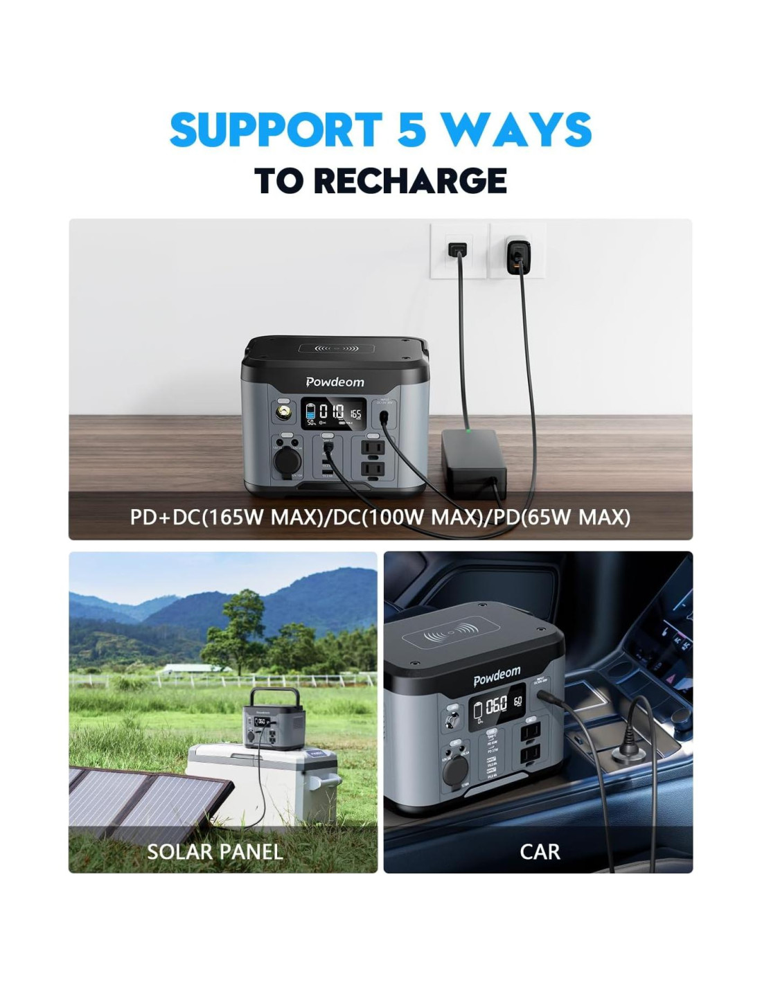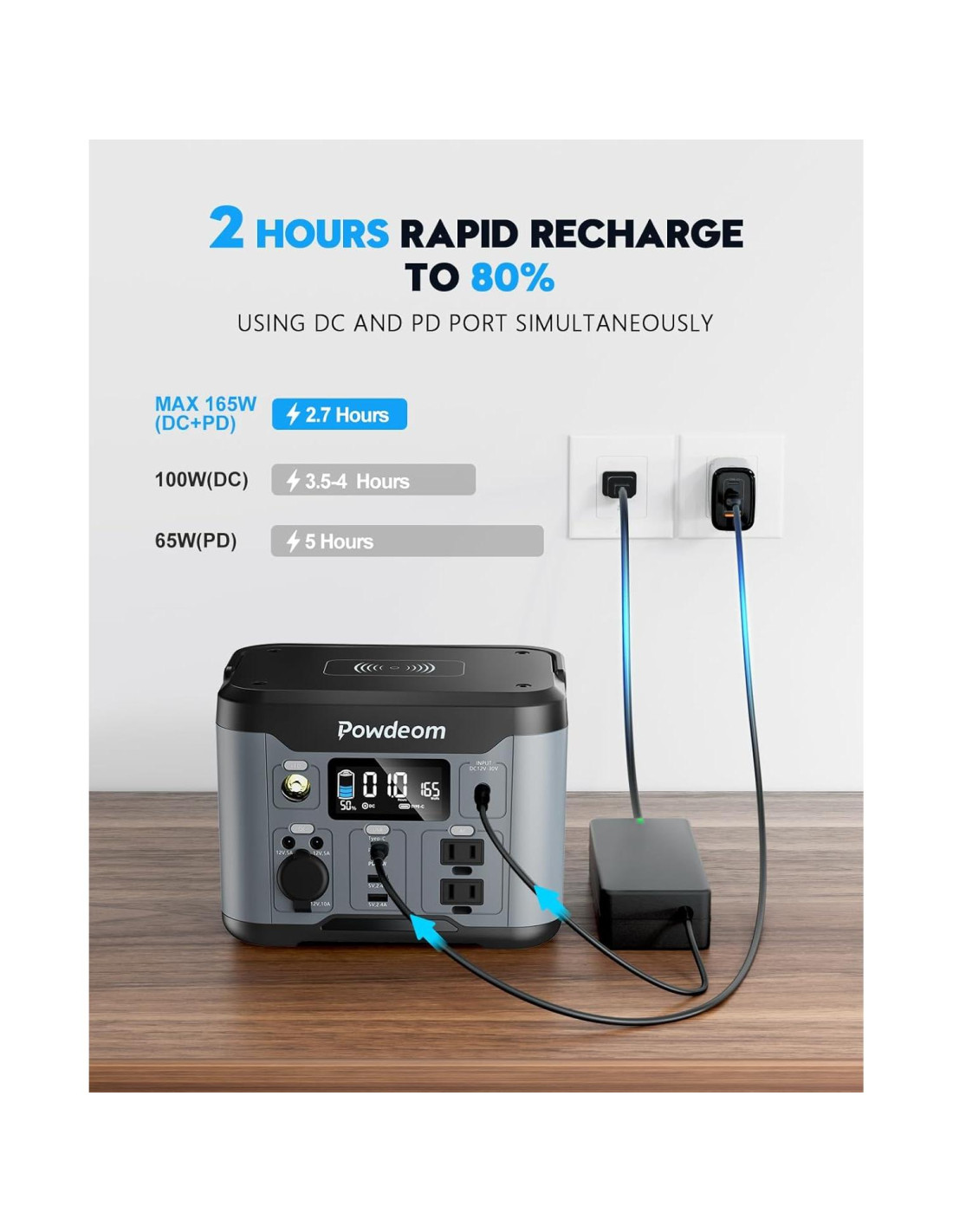 - 5 MANERAS DE RECARGA: El banco de energía Powdeom con salida se puede recargar mediante un enchufe de pared, puerto PD, cargador de coche o panel solar de 60W, incluso cargando juntos el enchufe de pared y el puerto PD. No importa si estás acampando al aire libre, de viaje o descansando en casa, puede ser cargado y utilizado completamente, manteniéndote conectado a energía ilimitada.