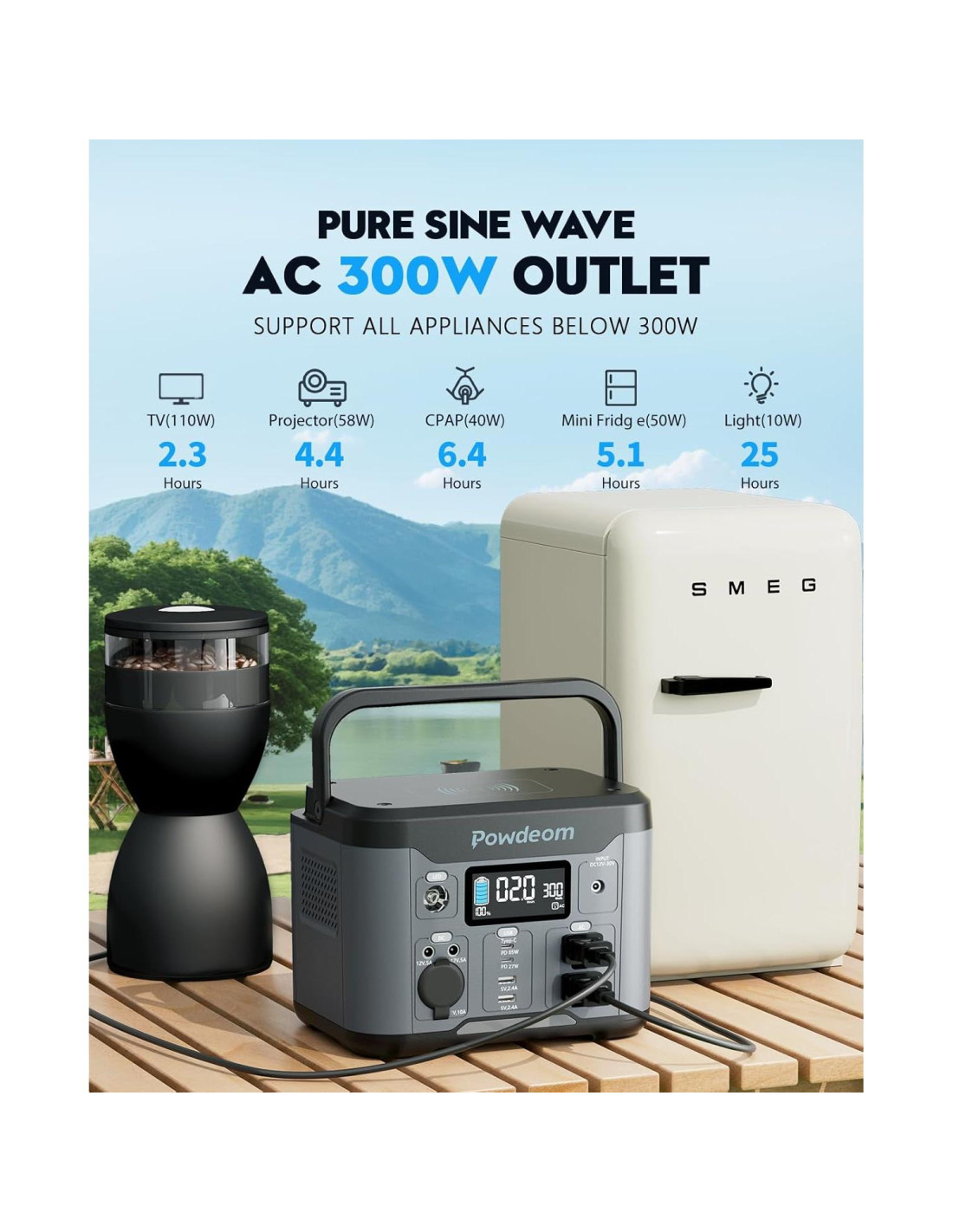 - SALIDA AC DE 300W EN ONDA SINUSOIDAL PURA: El banco de energía recargable con salida AC de 300W se puede usar para cargar y alimentar una amplia gama de dispositivos (potencia nominal menor a 300W), incluyendo laptops, mini refrigeradores, ventiladores, buscadores de peces, cpap, calefactores pequeños, pequeños electrodomésticos y otras herramientas de camping. Sirve como tu suministro de energía de emergencia y batería de respaldo, permitiéndote mantener tus dispositivos electrónicos cargados y funcionando en una emergencia.