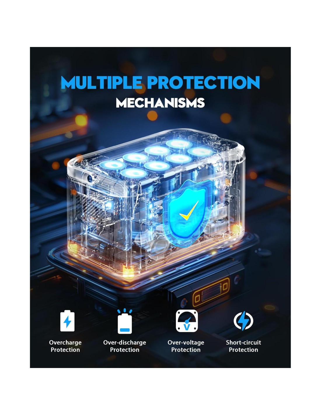- MÚLTIPLES MECANISMOS DE PROTECCIÓN: Nunca comprometemos la seguridad de este banco de baterías, el sistema de gestión de baterías (BMS) incorporado podría protegerlo de sobretemperatura, sobrevoltaje, sobrepotencia, sobrecorriente y cortocircuitos, sin importar si el clima es frío o caliente, ya sea al aire libre o en interiores.