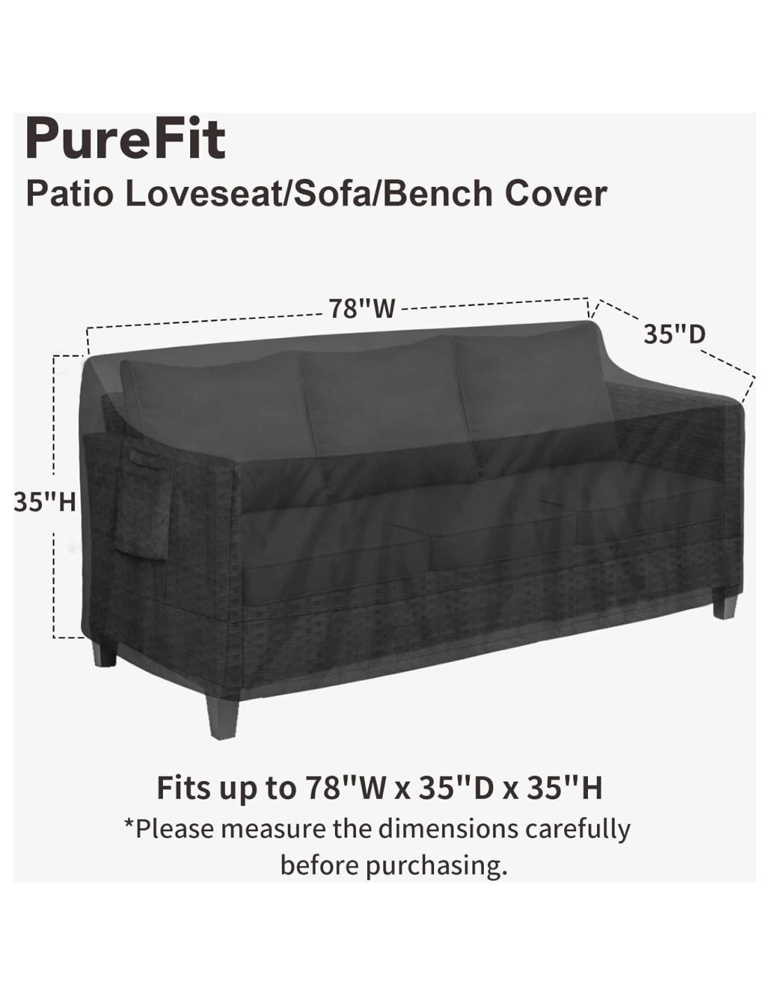 - Tamaño Adecuado: Nuestras cubiertas de sofá de exterior están hechas con varios tamaños para adaptarse a la mayoría de los muebles en su patio, jardín o jardín. Esta cubierta de sofá de 3 plazas se adapta hasta 78"W x 35"D x 35"H (198,12 cm x 88,90 cm x 88,90 cm), viene con 1 bolsa de almacenamiento, por favor mida su sofá antes de comprar.