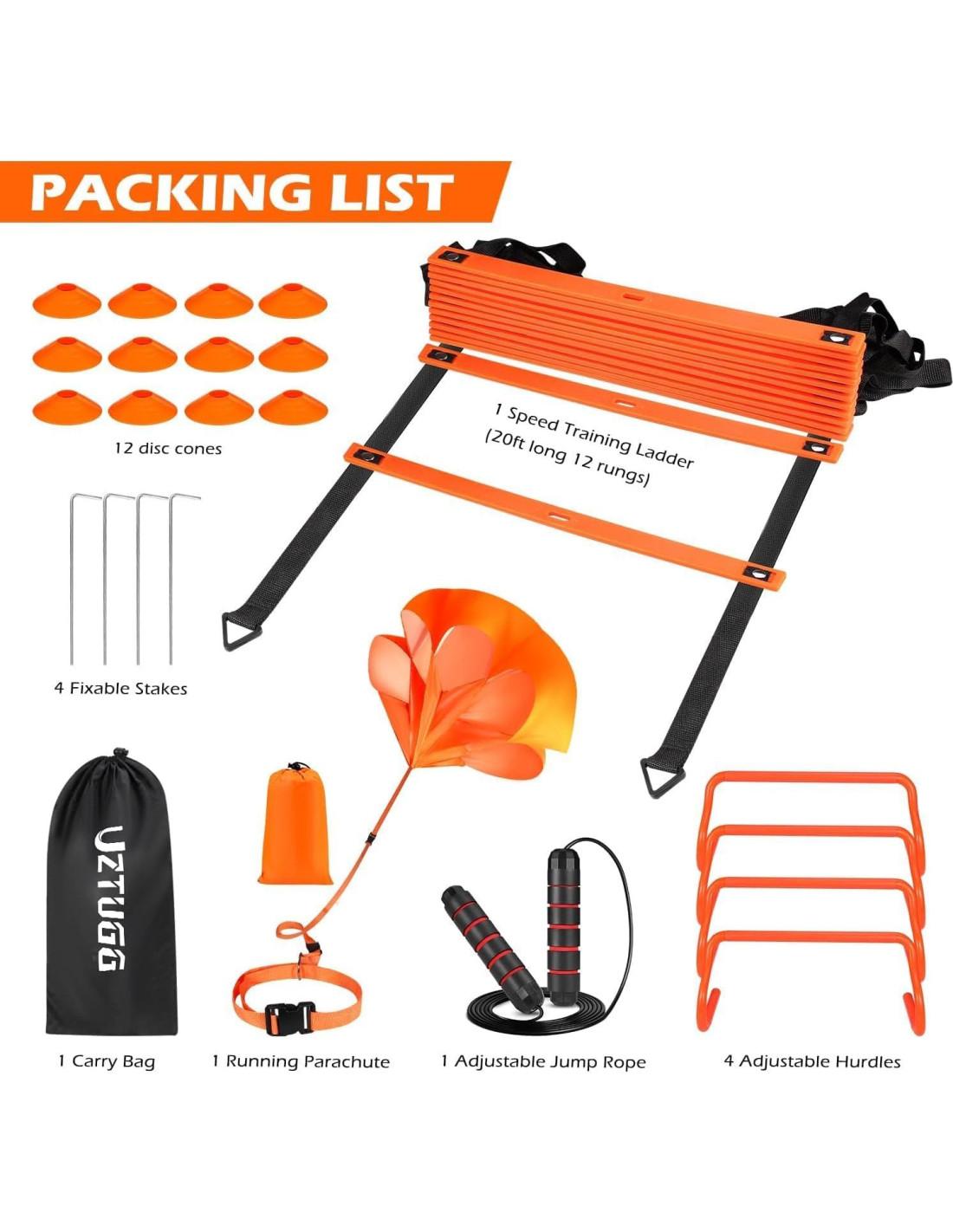 - Equipo de Entrenamiento Completo Nuestro completo conjunto de equipo de entrenamiento de velocidad y agilidad está diseñado para ayudarte a liberar todo tu potencial atlético. Con equipo de primera línea como la escalera de agilidad avanzada de 20 pies (6,10 m), vallas, conos, cuerda de saltar y un paracaídas de correr, estarás listo para un entrenamiento físico integral que atiende a entrenadores e individuos que buscan variedad en sus rutinas.