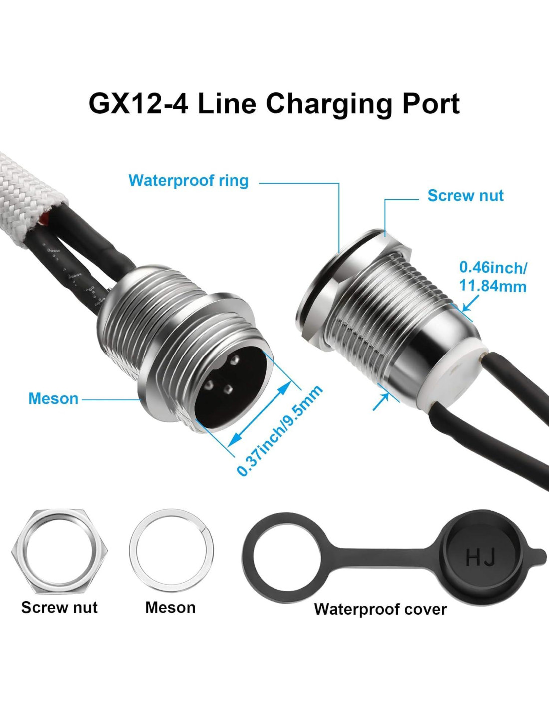 - Puerto de carga de línea GX12-4: cable de carga con puerto macho de 3 pines, enchufe blanco de 4 pines, tiene aproximadamente 9 pulgadas (24 cm) de longitud; El cable del interruptor de reinicio tiene aproximadamente 14.7 pulgadas (37.5 cm) de longitud