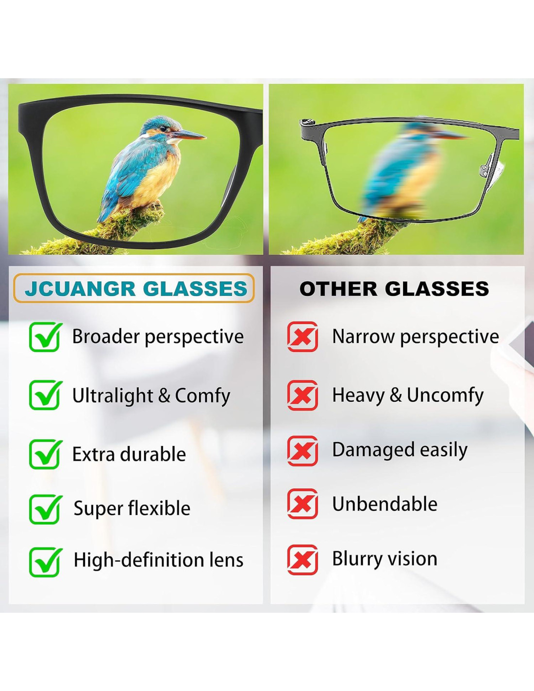 - [Marco Ligero, Cómodo e Irrompible] Las gafas de visión a distancia Jcuangr para hombres, extra anchas y de diseño, están hechas de material duradero y ecológico, con bisagra flexible de resorte, cómodas de llevar y adecuadas para la mayoría de las formas de cara de hombres y mujeres, incluyendo cabezas grandes y caras pequeñas. Las lentes de gafas de miopía para computadora con bloqueo de luz azul son irrompibles, con un diseño clásico rectangular resistente a rayones. Todo esto te brinda una experiencia de uso agradable.