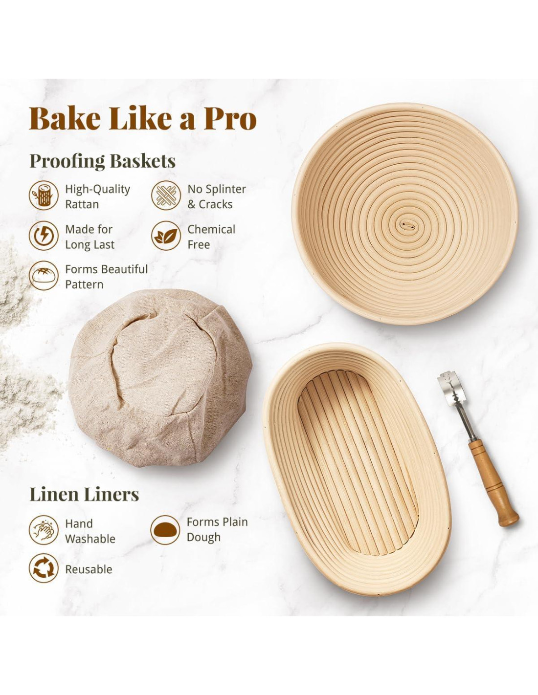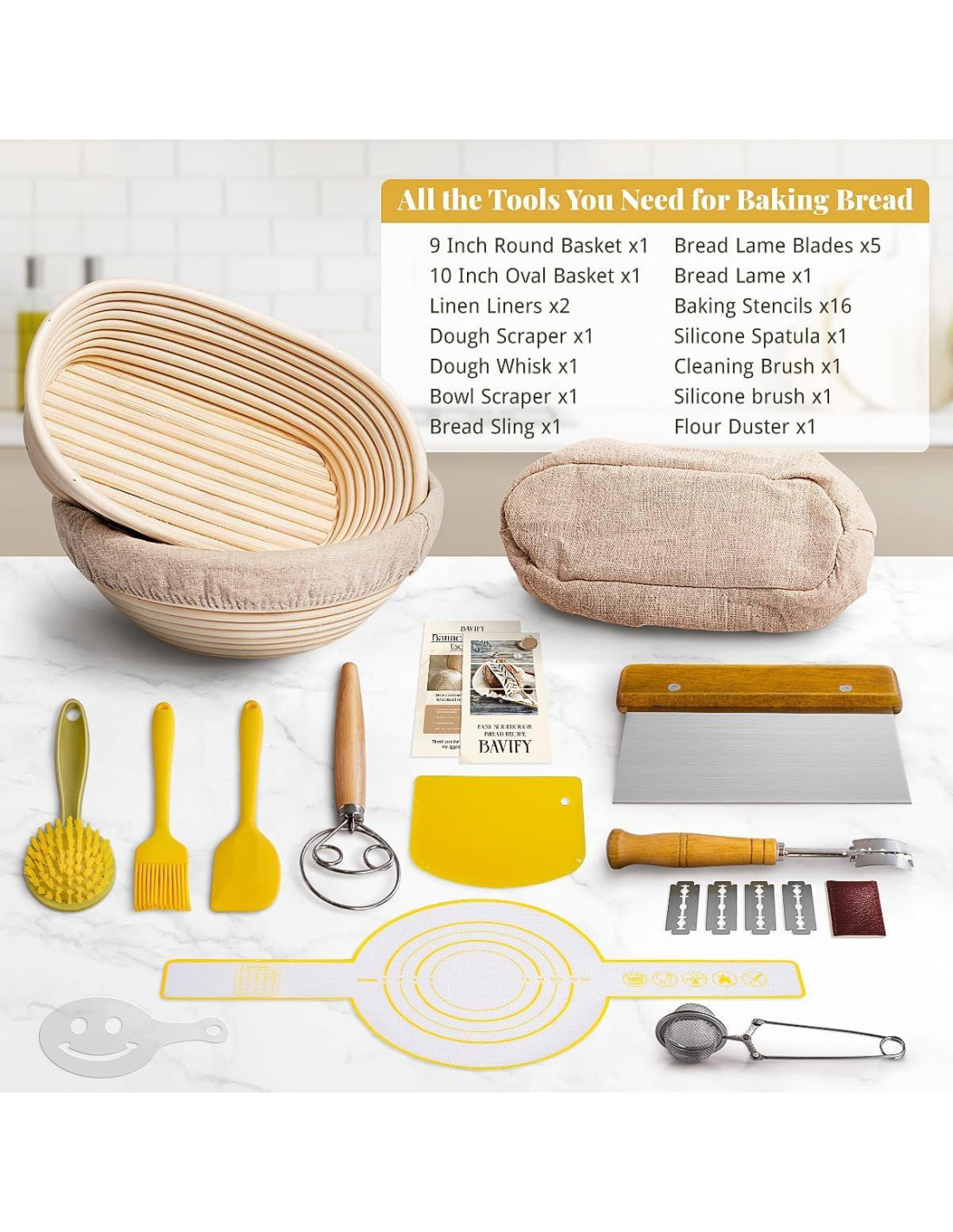 - Componentes incluidos: 1x cesta banneton redonda de 9 pulgadas (22,86 cm), 1x cesta de prueba ovalada de 10 pulgadas (25,4 cm), 2x forros de lino, 1x sling de silicona para pan, 1x batidor de masa, 1x raspador de masa, 1x raspador de tazón, 1x herramienta de puntuación de pan con 5 cuchillas, 1x espátula de silicona, 1x brocha de silicona, 1x tamiz para harina, 1x cepillo de limpieza, 16x plantillas para hornear