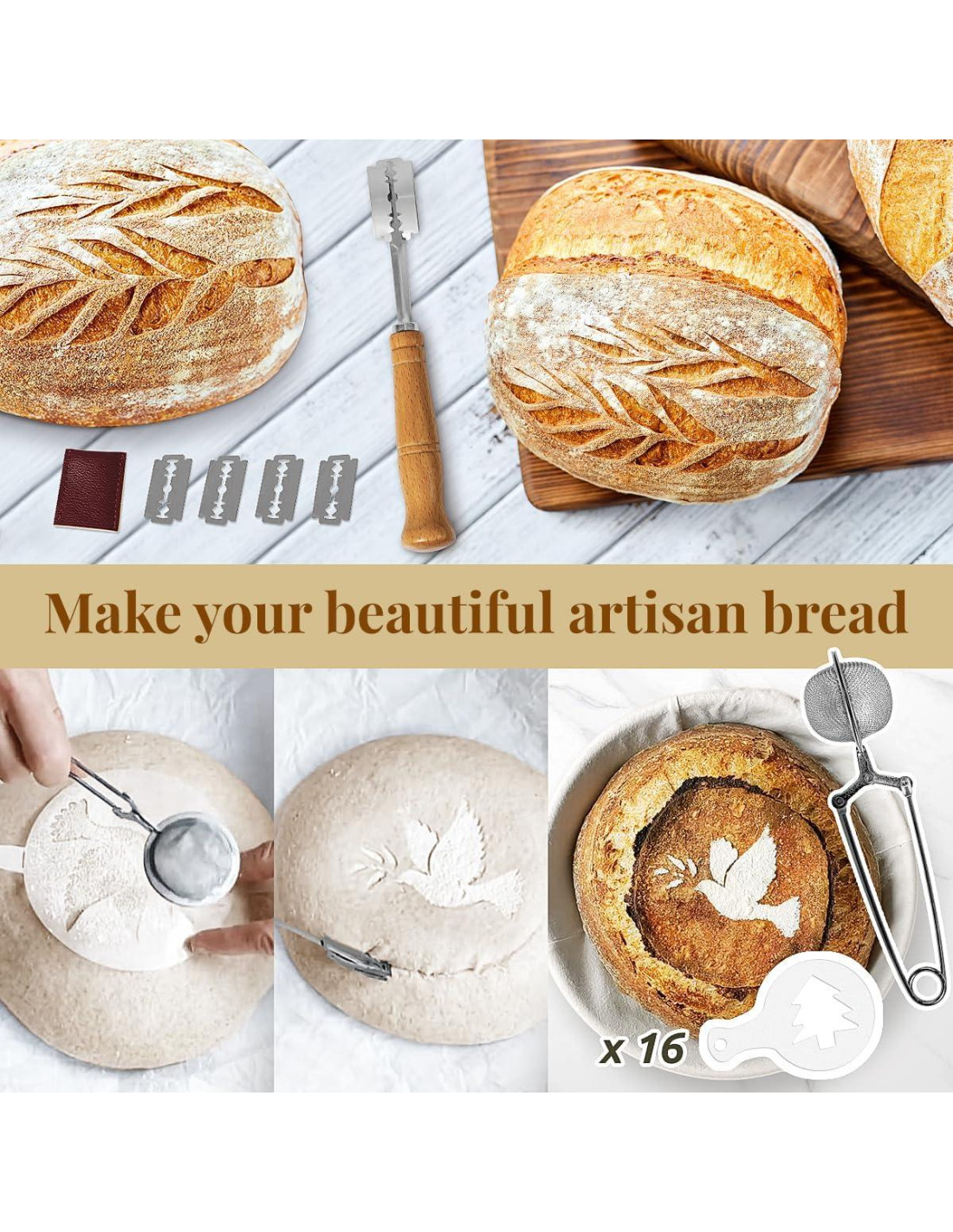 - Qué Recibirás: El kit de inicio de pan de masa madre incluye: 1x cesta banneton redonda de 9 pulgadas (22,86 cm), 1x cesta de prueba ovalada de 10 pulgadas (25,4 cm), 2x forros de lino, 1x sling de silicona para pan, 1x batidor de masa, 1x raspador de masa, 1x raspador de tazón, 1x herramienta de puntuación de pan con 5 cuchillas, 1x espátula de silicona, 1x brocha de silicona, 1x tamiz para harina, 1x cepillo de limpieza, 16x plantillas para hornear