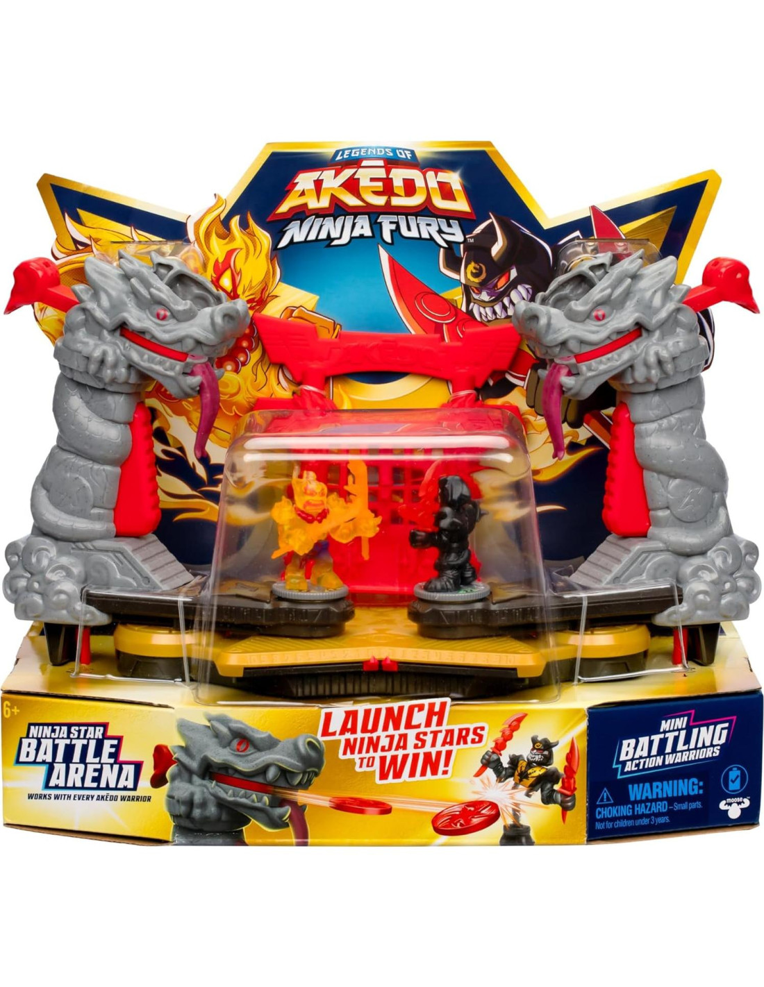 ¡Prepárate para el enfrentamiento ninja definitivo con la nueva Arena de Batalla de Estrellas Ninja de Akedo! Este épico campo de batalla cuenta con nuevos Controladores de Lanzamiento de Estrellas Ninja, que permiten a los niños liberar rápidamente una serie de discos desde la boca de un dragón. ¡Cuidado! Deben maniobrar a sus guerreros para esquivar estos discos entrantes, ya que un lanzamiento bien cronometrado puede causar un poderoso 'Golpe de Ruptura', dividiendo a su oponente en dos. ¿Puede tu hijo dominar el tiempo de lanzamiento del Disco Ninja para golpear a su oponente y ser victorioso en la batalla? Tu hijo se sumergirá aún más en emocionantes batallas con más de 35 efectos de sonido auténticos, mientras los estruendosos sonidos de las Estrellas Ninja volando por el aire amplifican la emoción de cada escaramuza. La arena cuenta con dos guerreros exclusivos: el feroz Oni Night Blade y el ardiente Supreme Flame Hi-Ashi. Cada uno está equipado con únicas Armas de Escudo para épicos duelos. Con una extensa selección de épicas armas en el Soporte de Armas, los niños pueden luchar, mezclar e intercambiar para encontrar el arma perfecta para cada duelo, culminando en un estratégico Golpe de Ruptura. ¡Prepárate, lucha y conviértete en una leyenda con la nueva Arena de Batalla Ninja Fury de Akedo!
